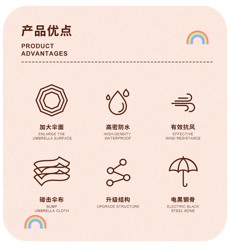 Product Name: 8-rib Wooden Straight Handle Umbrella Frame: Fiber ribs, iron central rod Canopy: Black rubber fabric Handle: Wooden straight handle Specifications: 685*8K Underside Diameter: 123CM Packaging: Individual fabric sleeve, OPP packaging Quantity per Box: 50 pieces/box Box Dimensions: 95*27*27CM Weight per Umbrella: 0.6KG Net/Gross Weight per Box: 24KG/25KG