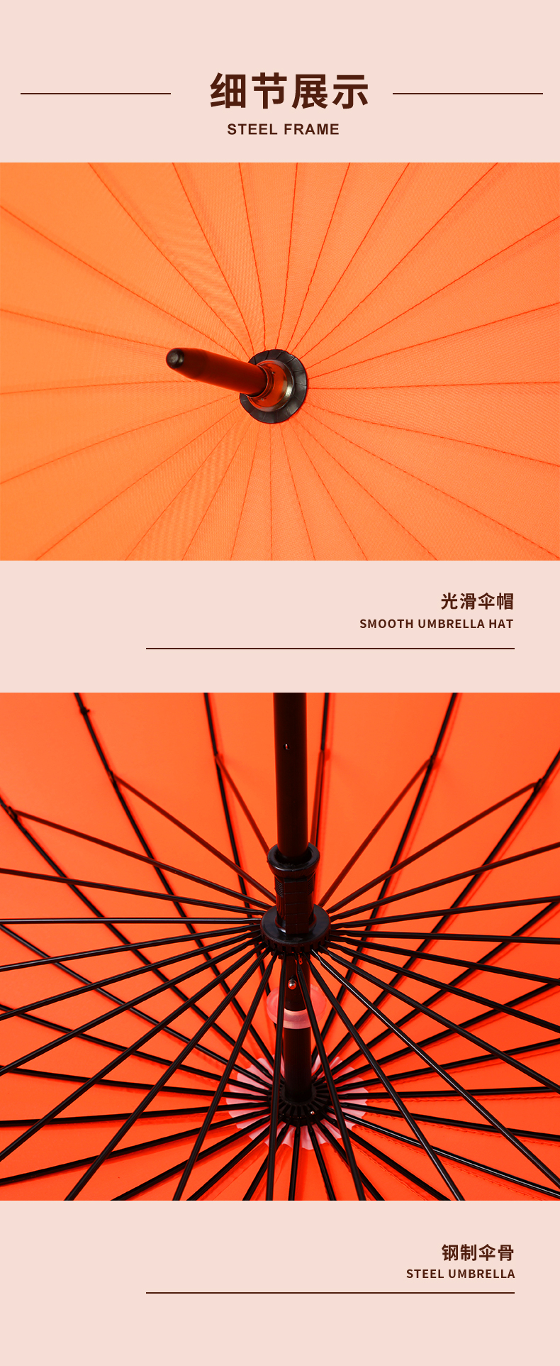 Product Name: 16-rib Wooden Straight Handle Umbrella Frame: Fiberglass ribs, iron central shaft Canopy: Black coated fabric Handle: Wooden straight handle Specification: 685*16K Umbrella Diameter: 123CM Packaging: Individual fabric sleeve, OPP packaging Quantity per Box: 50 pieces/box Box Dimensions: 95*27*27CM Weight per Umbrella: 0.6KG Net/Gross Weight per Box: 24KG/25KG