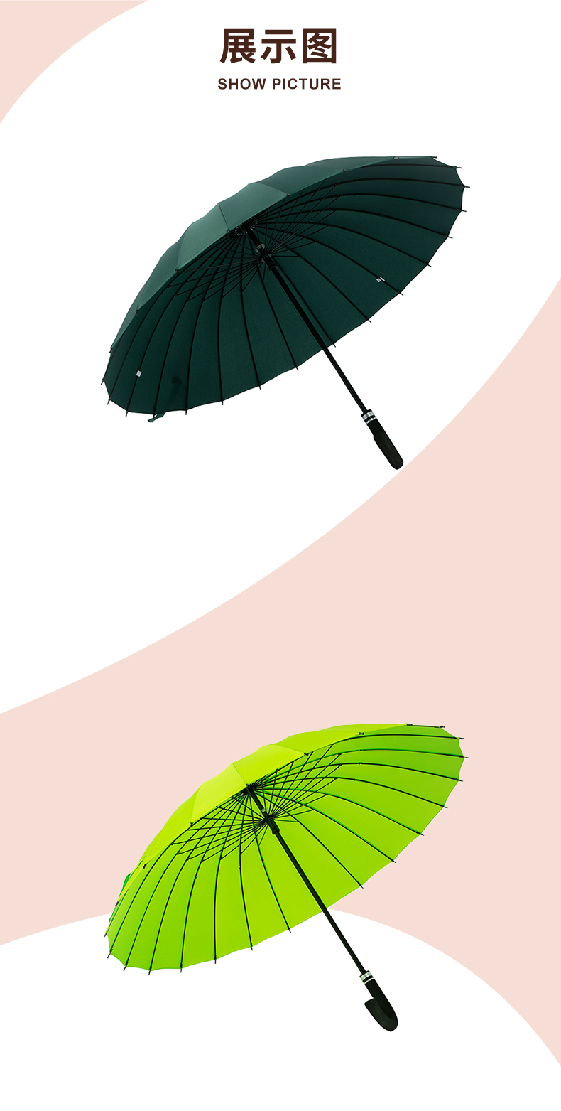 Product Name: 24-Rib Wooden Straight Handle Umbrella Frame: Fiberglass ribs, iron central shaft Canopy: Black coated fabric Handle: Wooden straight handle Specification: 685*24K Umbrella Diameter: 123CM Packaging: Individual fabric sleeve, OPP packaging Quantity per Box: 40 pieces/box Box Dimensions: 95*27*27CM Weight per Umbrella: 0.6KG Net/Gross Weight per Box: 24KG/25KG