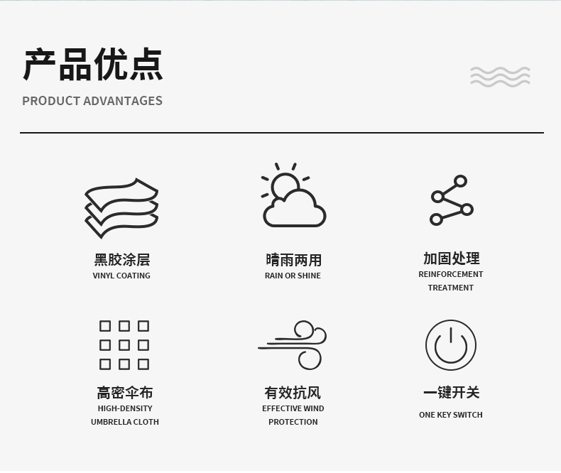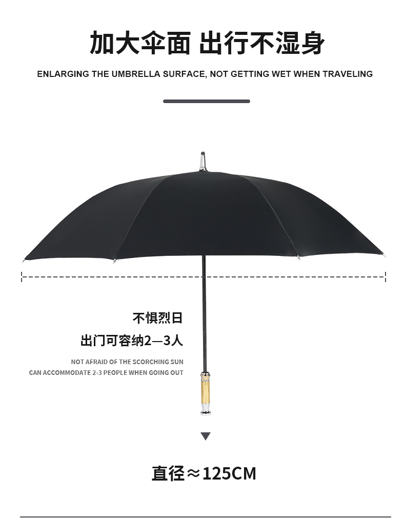 Product Name: 8-rib Wooden Straight Handle Umbrella Frame: Fiber ribs, iron central rod Canopy: Black rubber fabric Handle: Wooden straight handle Specifications: 685*8K Underside Diameter: 123CM Packaging: Individual fabric sleeve, OPP packaging Quantity per Box: 50 pieces/box Box Dimensions: 95*27*27CM Weight per Umbrella: 0.6KG Net/Gross Weight per Box: 24KG/25KG