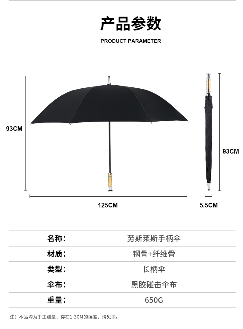 Product Name: 24-Rib Wooden Straight Handle Umbrella Frame: Fiberglass ribs, iron central shaft Canopy: Black coated fabric Handle: Wooden straight handle Specification: 685*24K Umbrella Diameter: 123CM Packaging: Individual fabric sleeve, OPP packaging Quantity per Box: 40 pieces/box Box Dimensions: 95*27*27CM Weight per Umbrella: 0.6KG Net/Gross Weight per Box: 24KG/25KG