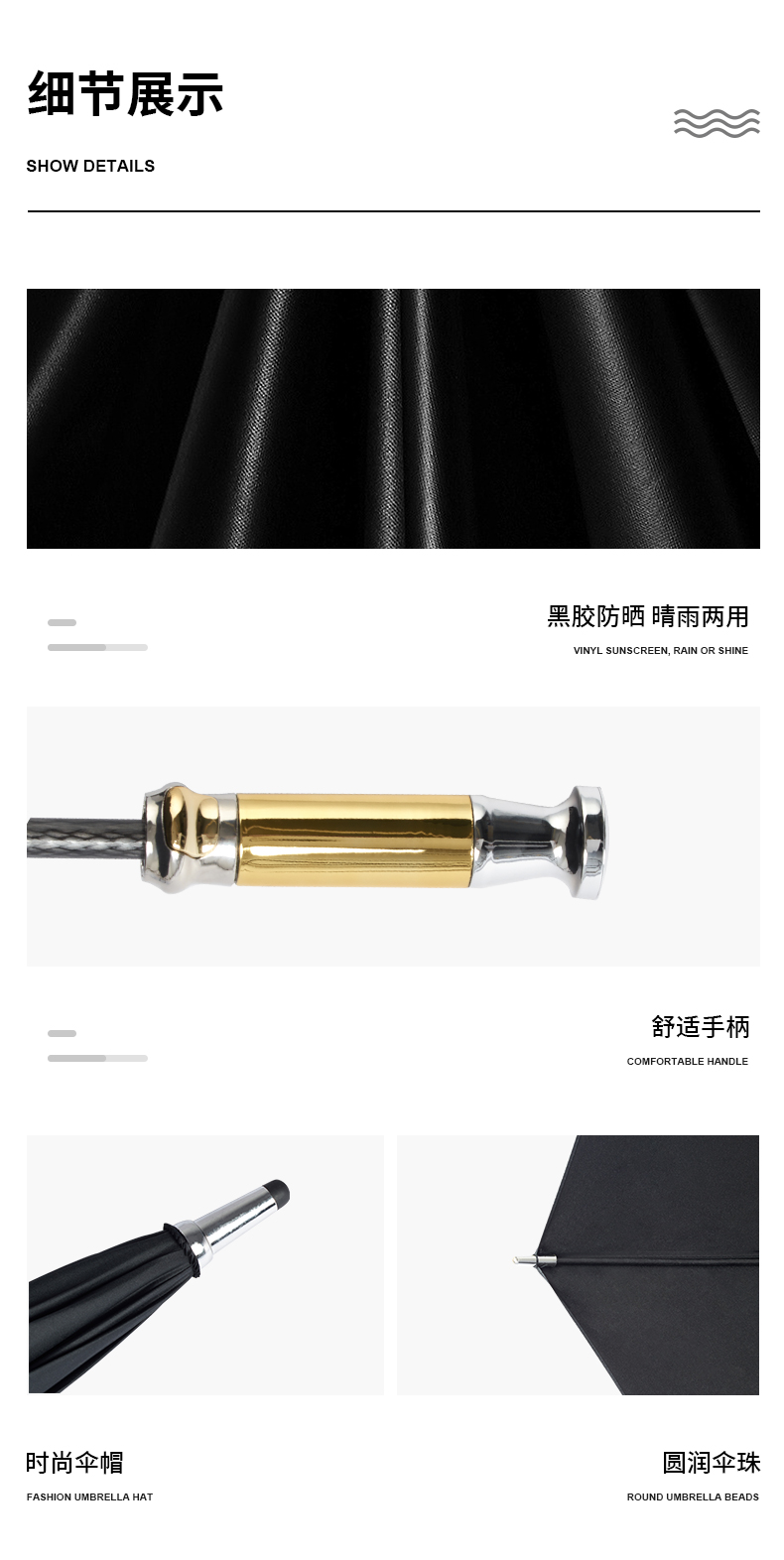 Product Name: 16-rib Wooden Straight Handle Umbrella Frame: Fiberglass ribs, iron central shaft Canopy: Black coated fabric Handle: Wooden straight handle Specification: 685*16K Umbrella Diameter: 123CM Packaging: Individual fabric sleeve, OPP packaging Quantity per Box: 50 pieces/box Box Dimensions: 95*27*27CM Weight per Umbrella: 0.6KG Net/Gross Weight per Box: 24KG/25KG