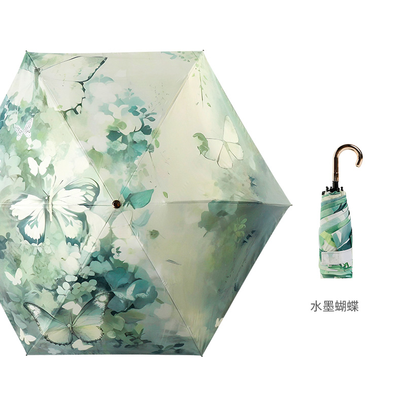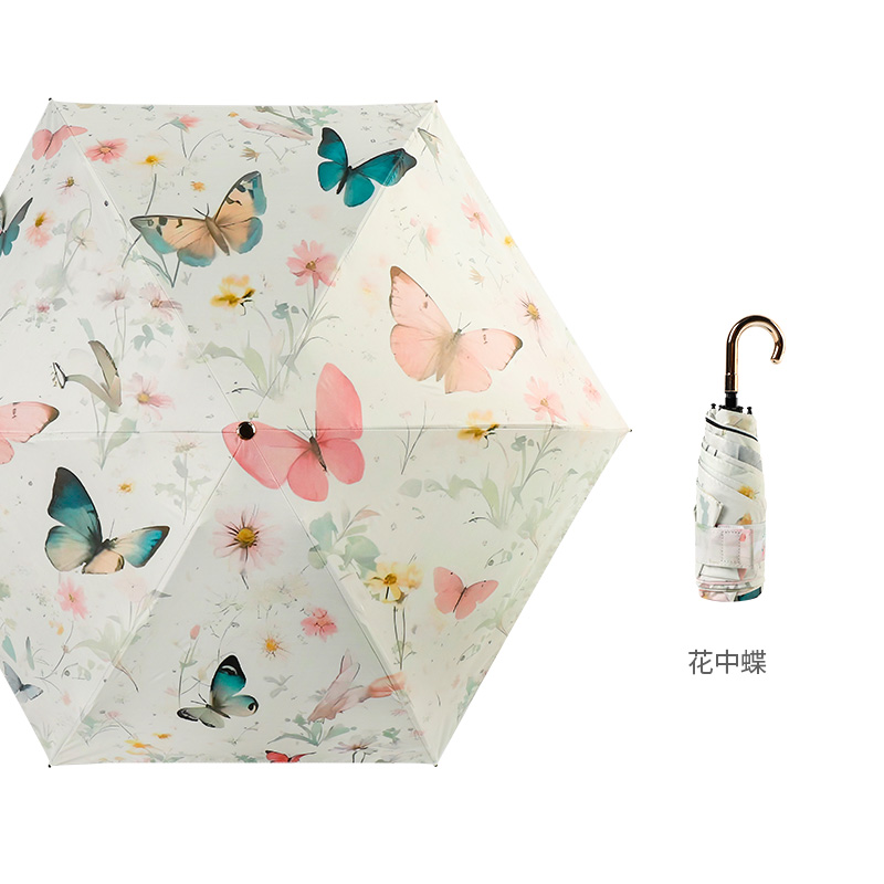 Name: Colorful Coated Five-Fold Umbrella Frame: Gold-colored aluminum alloy frame Canopy: Double-sided floral black coating fabric, semi-shading black coating Handle: Solid wood handle Specifications: 54*8, diameter under umbrella 96cm, folded length 18cm Packaging: Matching color fabric sleeve, bagged Quantity per box: 60 pieces/box Box dimensions: 50/32/30