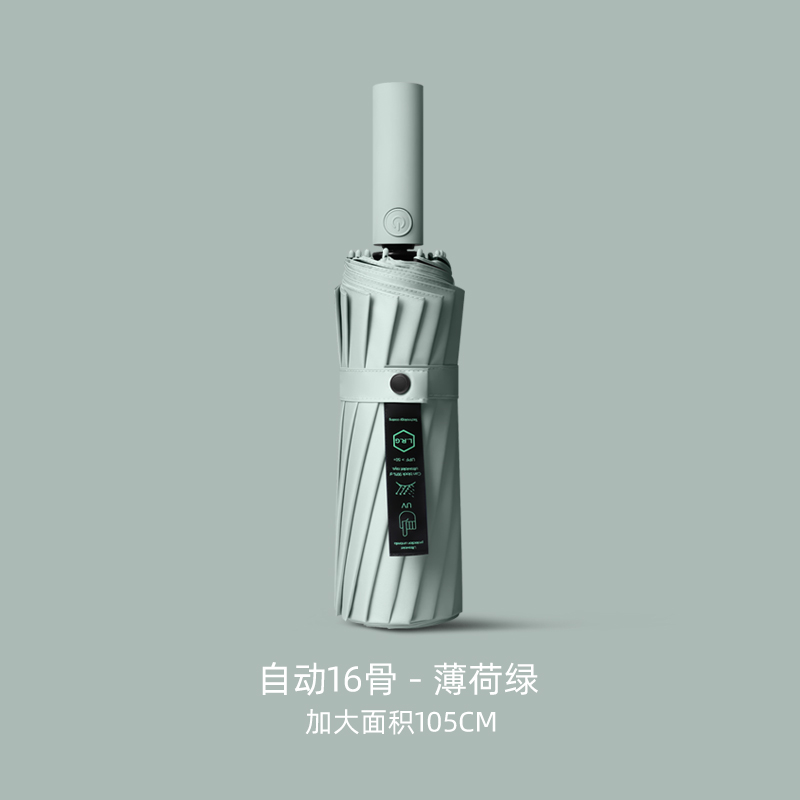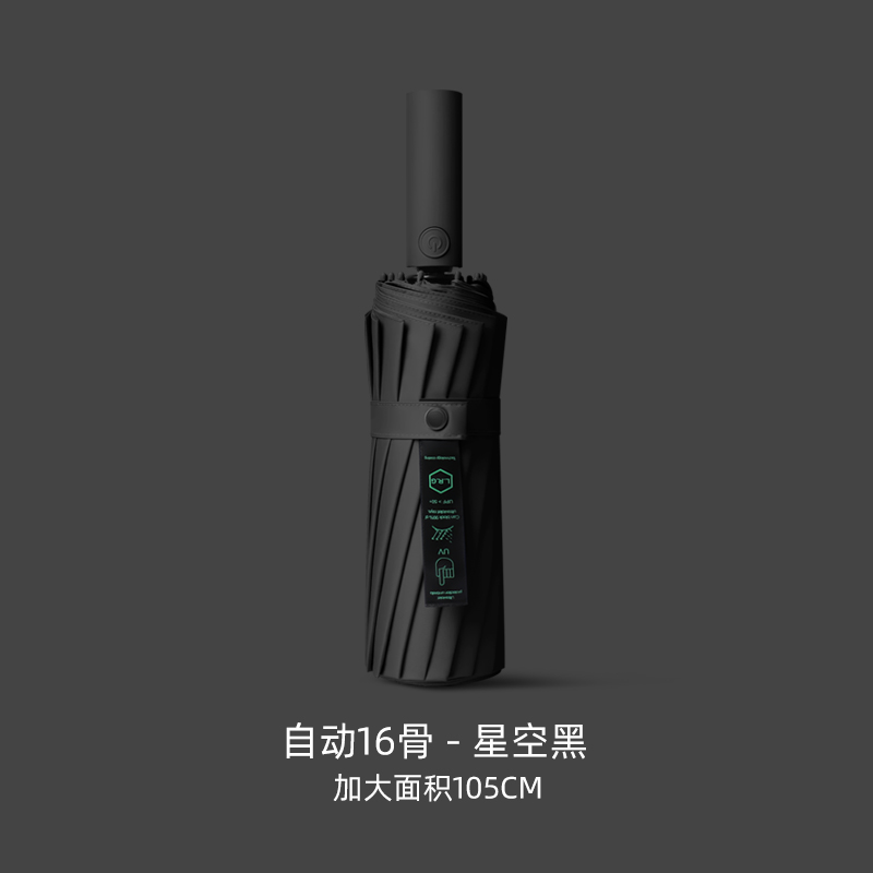 Name: Three-Fold Automatic Frame: Steel frame Canopy: Black coated fabric Handle: Rubber paint Specifications: 54*8, canopy diameter 95cm, folded length 16cm Packaging: Same-color cloth cover, matte bag packaging Quantity: 60 pieces/box Box dimensions: 48*30*28 cm Gross weight: 18KG