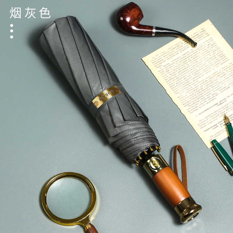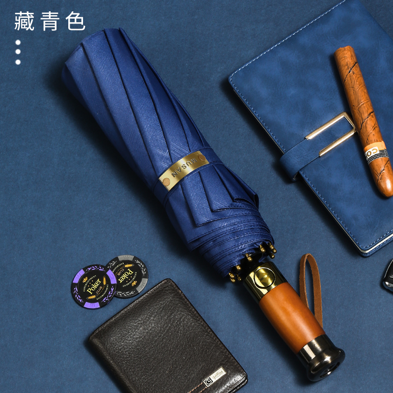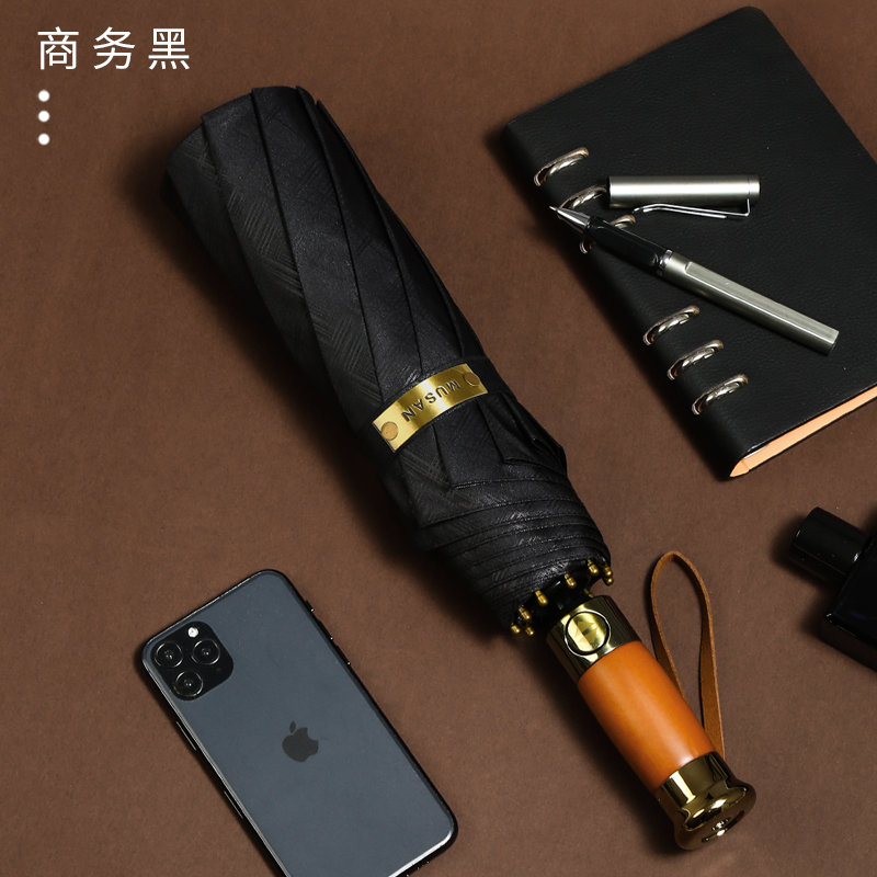 Name: Three-fold Automatic Umbrella Handle: Solid Wood Frame: Steel ribs with additional steel support Canopy Fabric: Densely woven impact-resistant fabric Specifications: 58.5*10 cm, Diameter when open: 110 cm, Length when folded: 36 cm Packaging: OPP bag Quantity: 40 pieces/box Box Size: 42*36*30 cm Gross Weight: 20 KG
