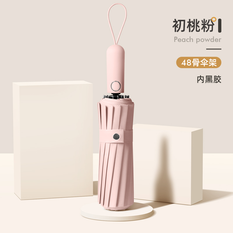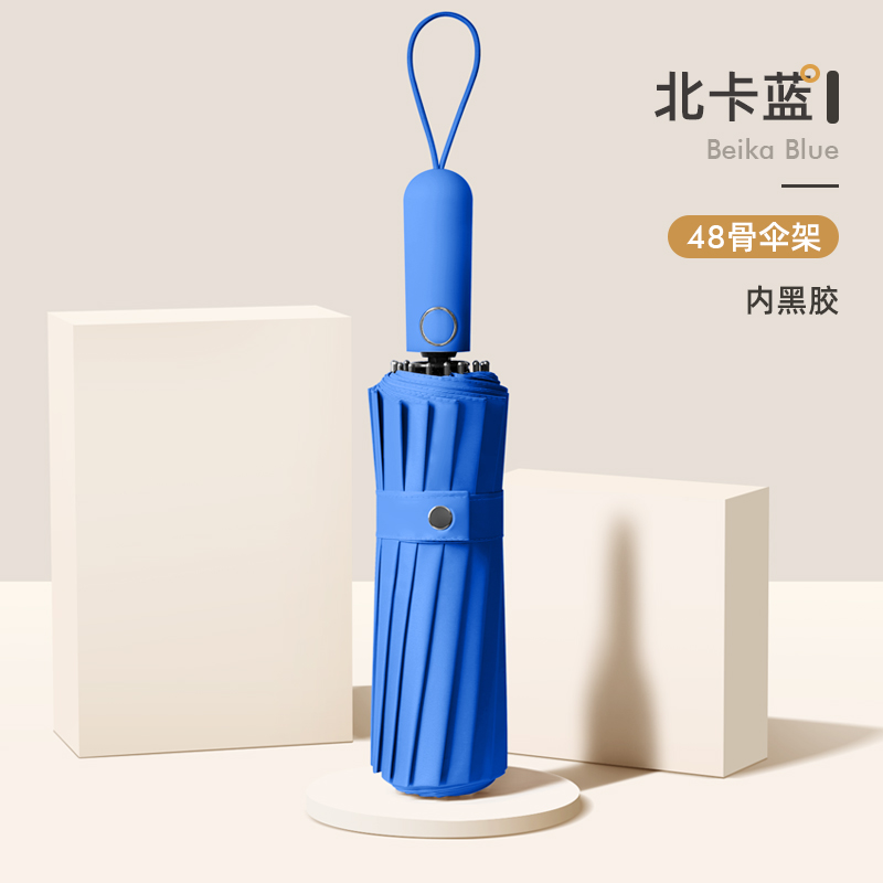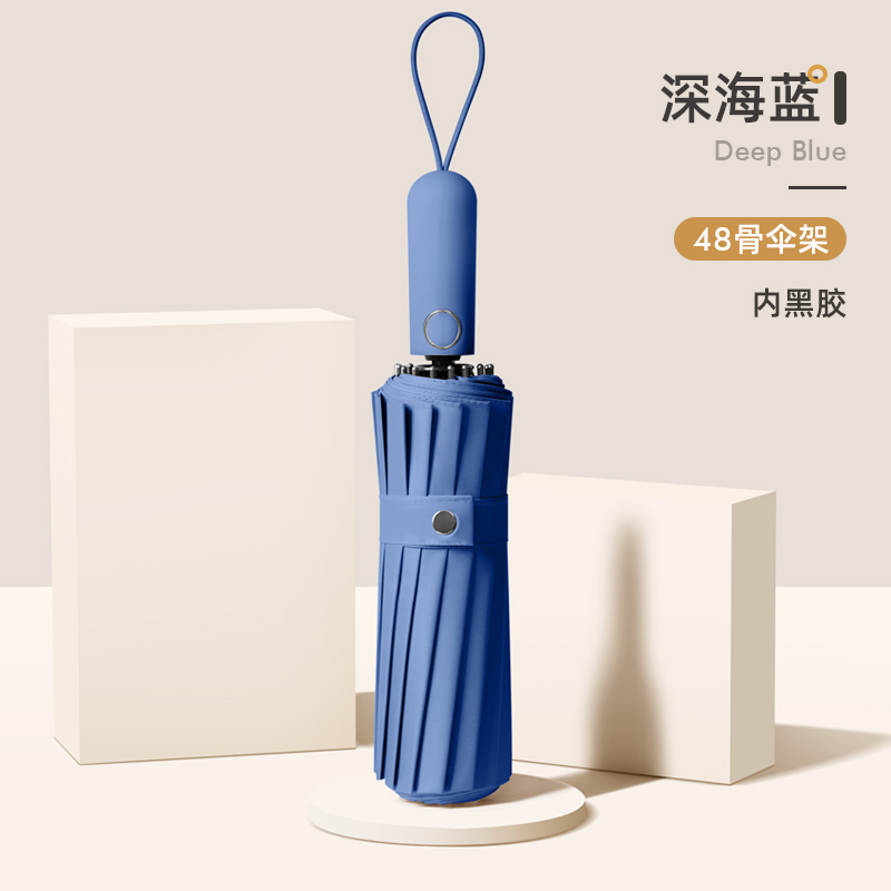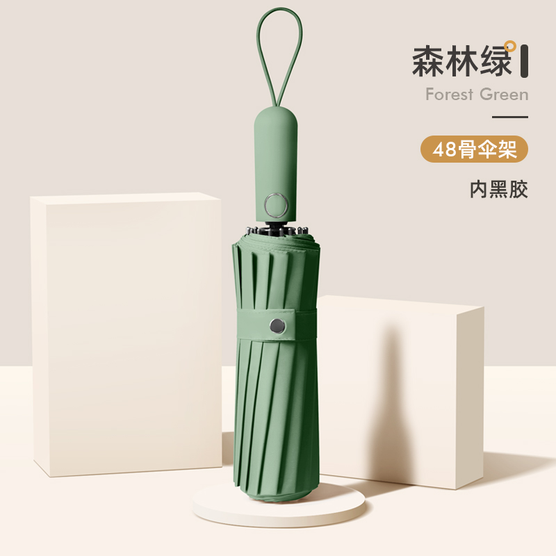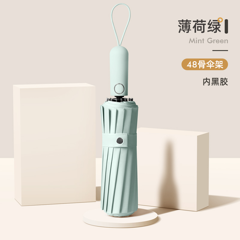 Name: Three-Fold Automatic Frame: Steel frame Canopy: Black coated fabric Handle: Rubber paint Specifications: 54*8, canopy diameter 95cm, folded length 16cm Packaging: Same-color cloth cover, matte bag packaging Quantity: 60 pieces/box Box dimensions: 48*30*28 cm Gross weight: 18KG