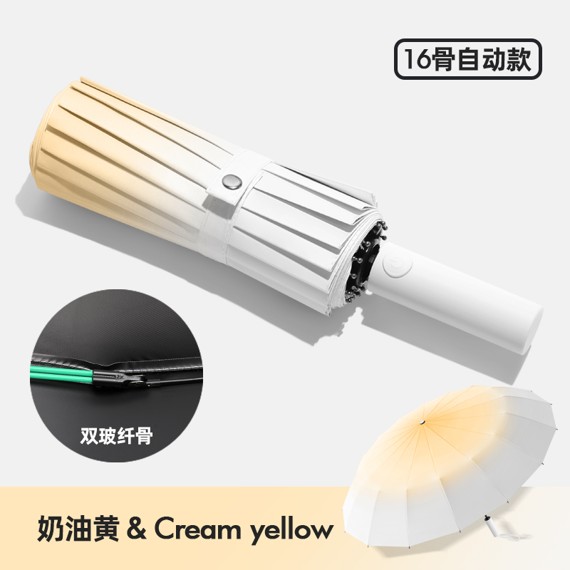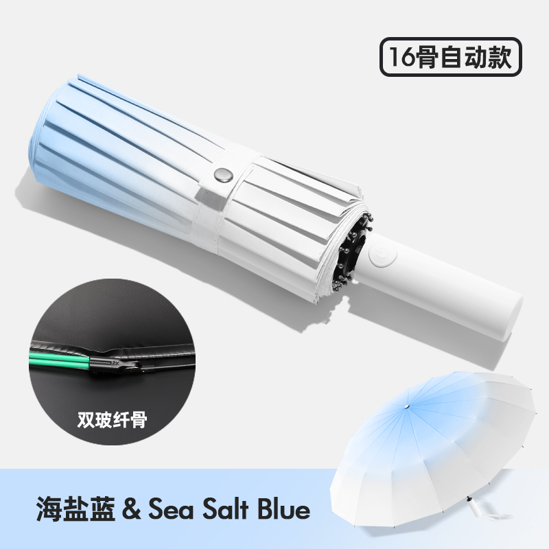 Name: 16-Rib Gradient Automatic Umbrella with Double Fiberglass Ribs (32 Ribs) Frame: Steel frame with fiberglass Canopy Fabric: Black rubberized fabric Handle: ABS handle Dimensions: 58.5*12 cm, Diameter when open: 105 cm, Length when folded: 32 cm Packaging: Matching color cloth cover, frosted bag Packing Quantity: 50 pieces/box Box Size: 48*35*28 cm Single Umbrella Packaging Size: 34*6.5*6.5 cm Weight: 10 ribs: 0.42 kg 12 ribs: 0.52 kg 16 ribs: 0.57 kg Gross Weight: 10 ribs: 22 kg 12 ribs: 26.5 kg 16 ribs: 29 kg