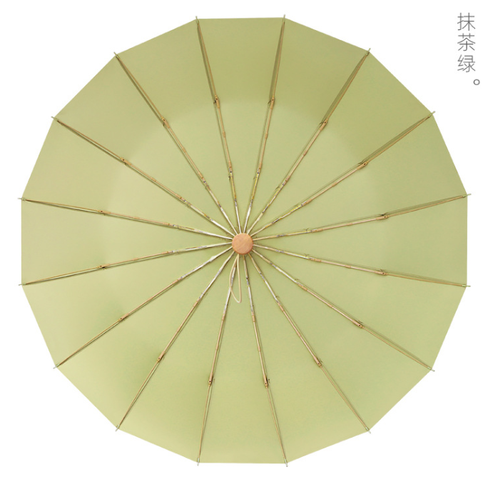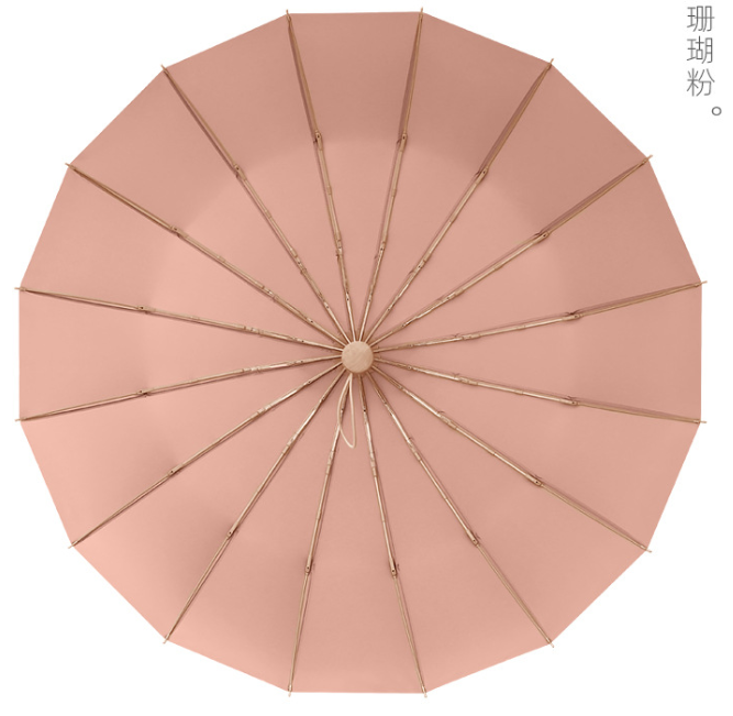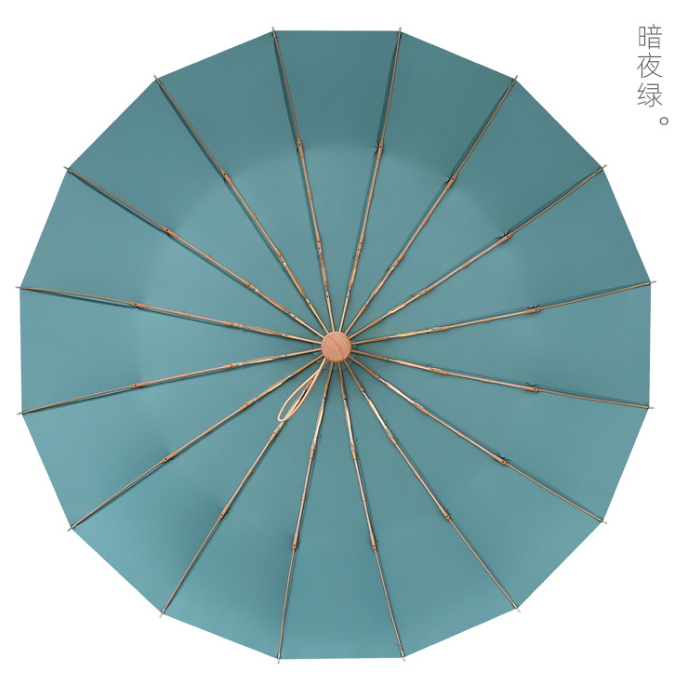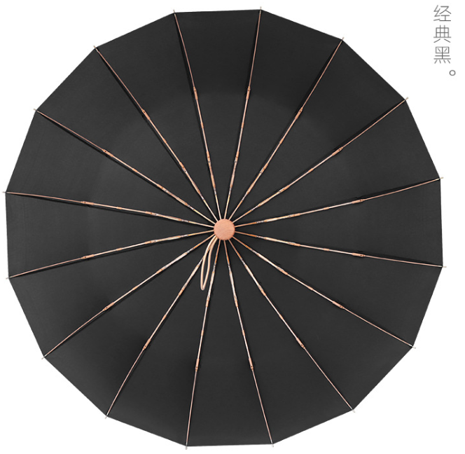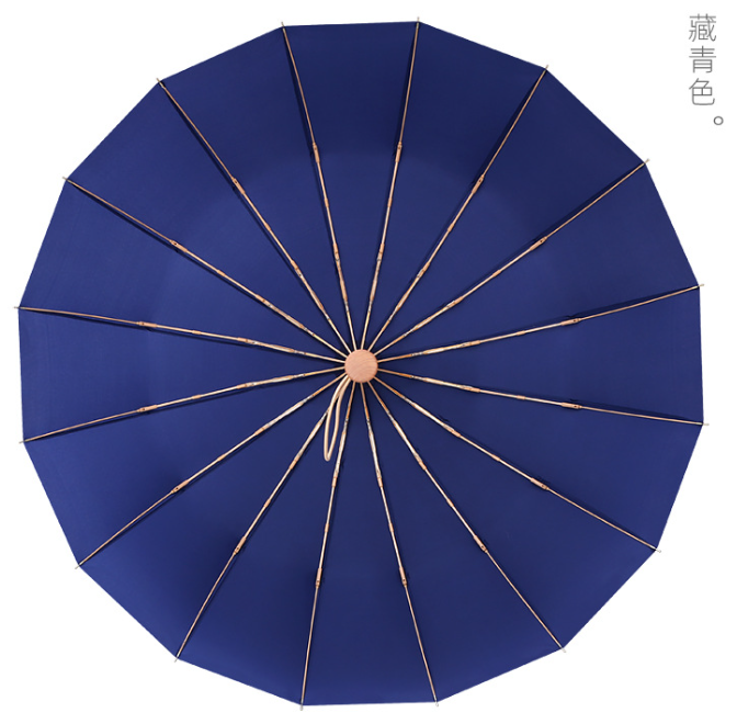 Name: Three-fold manual 16-rib umbrella Frame: Gold aluminum alloy Canopy: Pongee fabric Handle: Solid wood handle Specifications: 54*16, diameter under umbrella 100cm, folded length 28cm Packaging: Same-color fabric sleeve, frosted bag Quantity per box: 50 pcs/box Box dimensions: 50*32*30 cm Individual umbrella packaging size: 30*7*7 cm Weight: 0.42 kg Gross weight: 21 kg