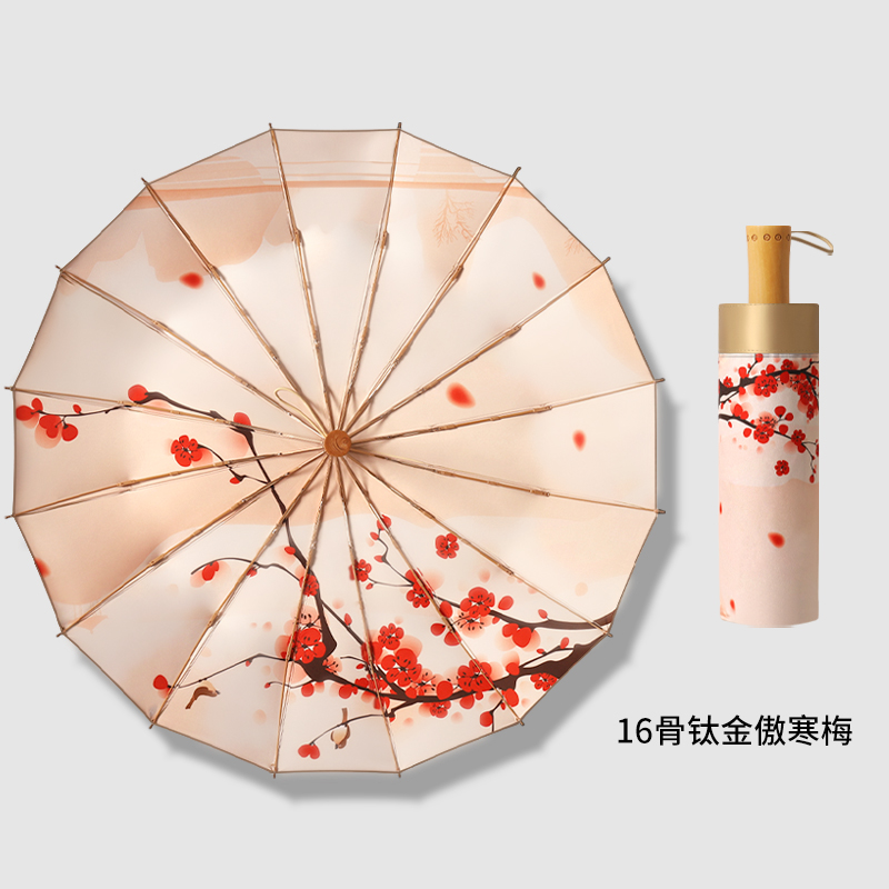 Name: Three-Fold Manual 16-Rib Umbrella Frame: Golden Aluminum Alloy Canopy: Black Coated Fabric Handle: Solid Wood Handle Specifications: 54*16, Diameter under umbrella 100cm, Folded length 28cm Packaging: Matching color fabric cover, frosted bag Quantity per carton: 50 pieces/carton Carton size: 50*32*30 cm Individual umbrella packaging size: 30*7*7 cm Weight: 0.42 kg Gross weight: 21 kg