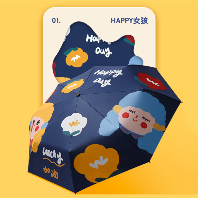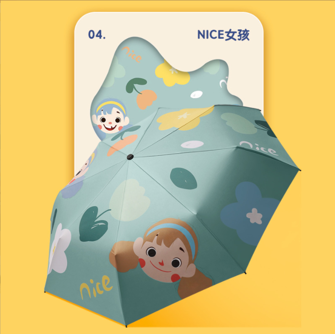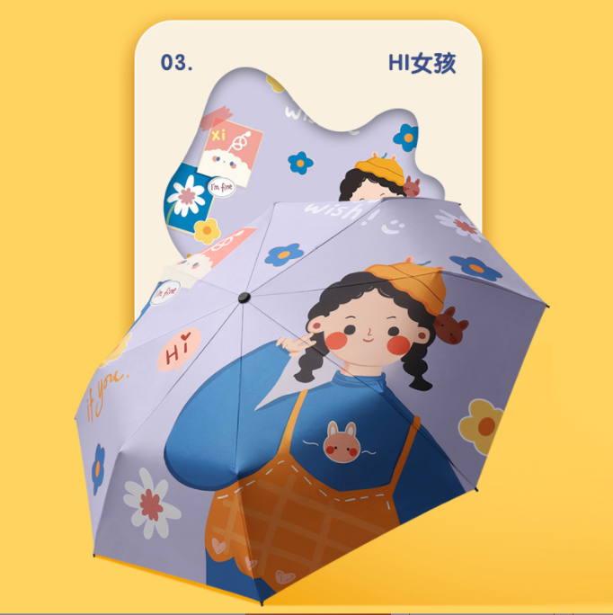 Name: Three-fold Manual Digital Print Little Girl Umbrella Frame: Black painted steel frame Canopy: Thickened black coating Handle: Solid wood handle Specifications: 54*8 Diameter when open: 98cm, Length when folded: 18cm Packaging: Matching color fabric cover, matte bag packaging Quantity: 60 pcs/box, Box dimensions: 50*32*30 cm Single umbrella packaging size: 30*6*6 cm Weight: 0.32 kg Gross weight: 20.9 kg