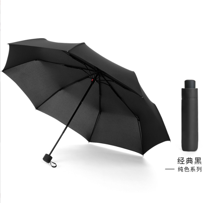 Name: Three-Fold Automatic Frame: Steel frame Canopy: Black coated fabric Handle: Rubber paint Specifications: 54*8, canopy diameter 95cm, folded length 16cm Packaging: Same-color cloth cover, matte bag packaging Quantity: 60 pieces/box Box dimensions: 48*30*28 cm Gross weight: 18KG