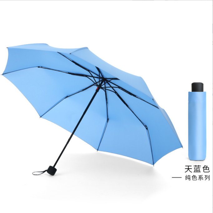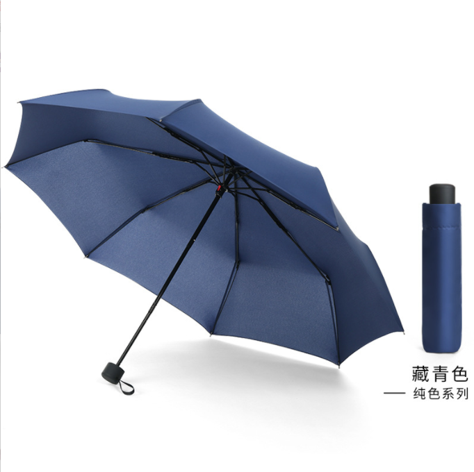 Name: Manual Three-Fold Umbrella Frame: Steel frame Canopy: Densely woven fabric Handle: Rubber-coated handle Specifications: 54*8, diameter when open 98cm, length when folded 18cm Packaging: Matching color fabric sleeve, frosted bag packaging Quantity: 60 pieces/box Box dimensions: 50/32/30 cm Gross weight: 16KG
