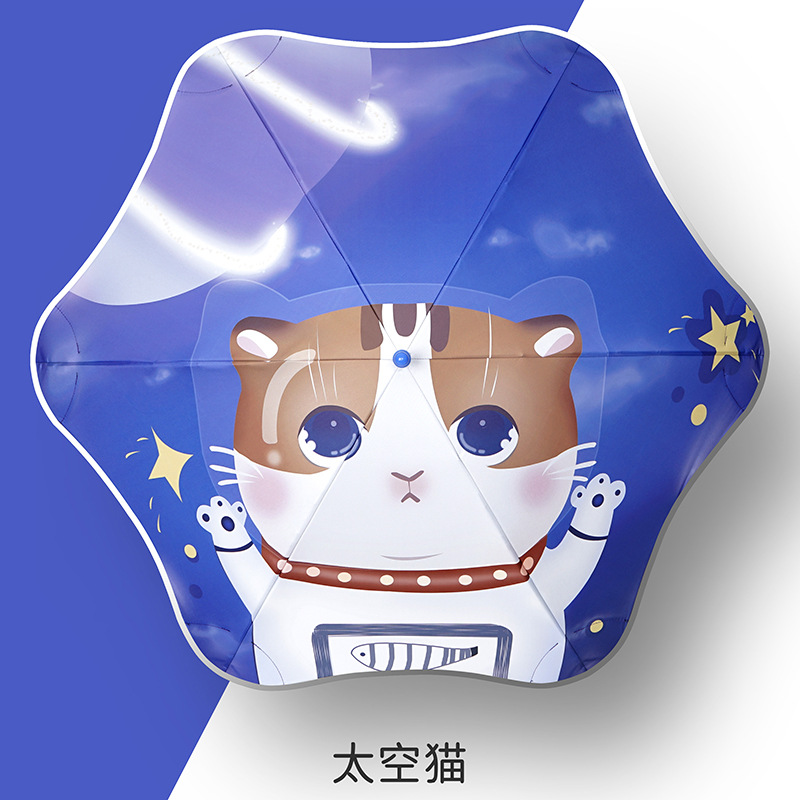 Name: Three-Fold Astronaut Umbrella Frame: Steel frame with fiber double ribs Canopy: Black-coated fabric Handle: Astronaut handle Size: 54*8 cm Diameter when open: 102 cm, Length when folded: 31 cm Packaging: Matching color fabric cover, OPP bag packaging Quantity: 60 pcs/box Box dimensions: 45/35/30 cm Gross weight: 17 kg