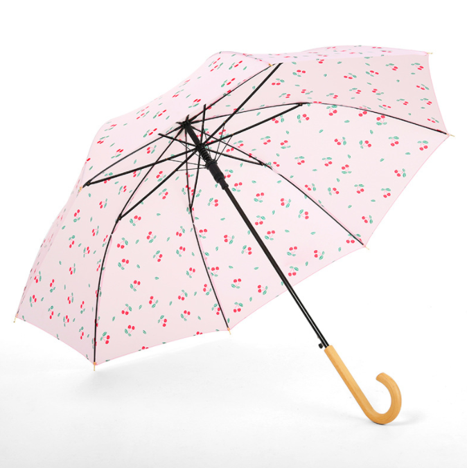 Name: Straight Rod Cherry Umbrella Frame: Steel frame with fiber Canopy: Densely woven fabric with digital printing Handle: Solid wood handle Specifications: 58.5*8 Umbrella diameter when open: 100cm, length when folded: 86cm Packaging: OPP bag Quantity: 40 pieces per box Box dimensions: 100/25/25 Gross weight: 20KG