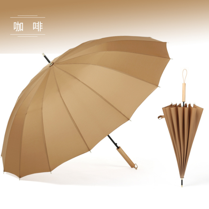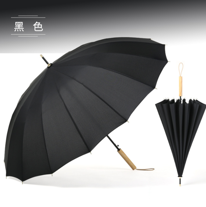 Product Name: 16-rib Wooden Straight Handle Umbrella Frame: Fiberglass ribs, iron central shaft Canopy: Black coated fabric Handle: Wooden straight handle Specification: 685*16K Umbrella Diameter: 123CM Packaging: Individual fabric sleeve, OPP packaging Quantity per Box: 50 pieces/box Box Dimensions: 95*27*27CM Weight per Umbrella: 0.6KG Net/Gross Weight per Box: 24KG/25KG