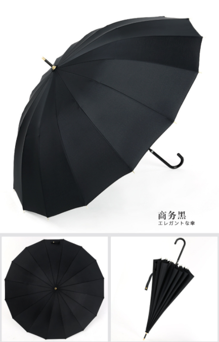 Product Name: 16-rib Wooden Straight Handle Umbrella Frame: Fiberglass ribs, iron central shaft Canopy: Black coated fabric Handle: Wooden straight handle Specification: 685*16K Umbrella Diameter: 123CM Packaging: Individual fabric sleeve, OPP packaging Quantity per Box: 50 pieces/box Box Dimensions: 95*27*27CM Weight per Umbrella: 0.6KG Net/Gross Weight per Box: 24KG/25KG