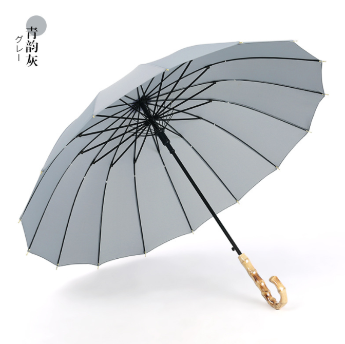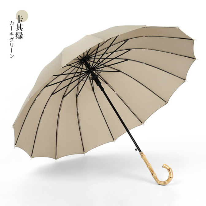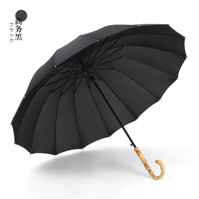 Name: 16-Rib Bamboo Handle Straight Umbrella Frame: Steel frame with fiberglass Canopy: Dense pongee fabric Handle: Bamboo handle Specification: 58.5*16 Diameter under umbrella: 106cm, Length when folded: 86cm Packaging: OPP Quantity: 40 pcs/box Box dimensions: 100/25/25 Single umbrella packaging size: 89*11*11*11 Weight: 0.45kg Gross weight: 18.15kg