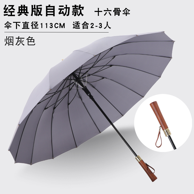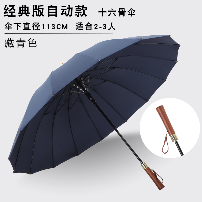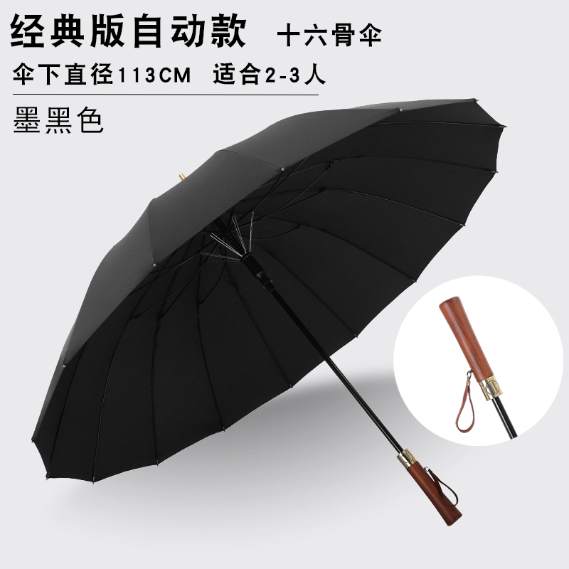 Name: 16-Rib Straight Umbrella SJ Frame: Full Fiber Frame Canopy: Pongee Fabric Handle: Solid Wood Handle with Cord Specifications: 63.5*16 Umbrella Diameter: 113cm, Folded Length: 86cm Packaging: OPP Quantity: 40 pcs/box Box Dimensions: 100*25*25 cm Gross Weight: 22KG