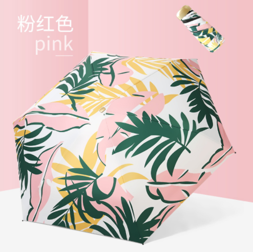 Name: Colorful Coated Five-Fold Umbrella Frame: Gold-colored aluminum alloy frame Canopy: Double-sided floral black coating fabric, semi-shading black coating Handle: Solid wood handle Specifications: 54*8, diameter under umbrella 96cm, folded length 18cm Packaging: Matching color fabric sleeve, bagged Quantity per box: 60 pieces/box Box dimensions: 50/32/30