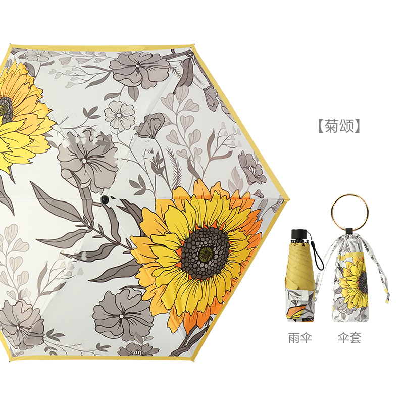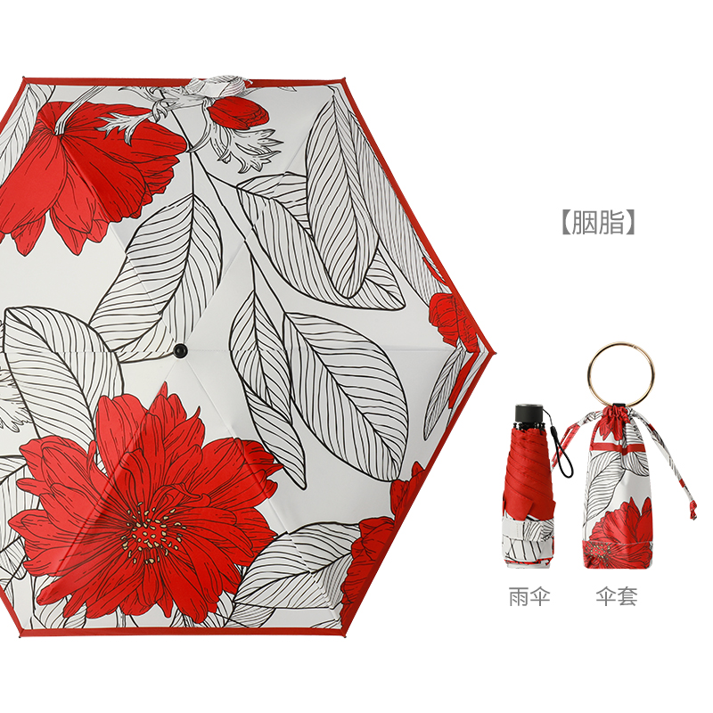 Name: Colorful Coated Five-Fold Umbrella Frame: Gold-colored aluminum alloy frame Canopy: Double-sided floral black coating fabric, semi-shading black coating Handle: Solid wood handle Specifications: 54*8, diameter under umbrella 96cm, folded length 18cm Packaging: Matching color fabric sleeve, bagged Quantity per box: 60 pieces/box Box dimensions: 50/32/30