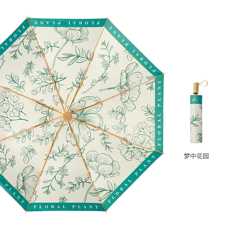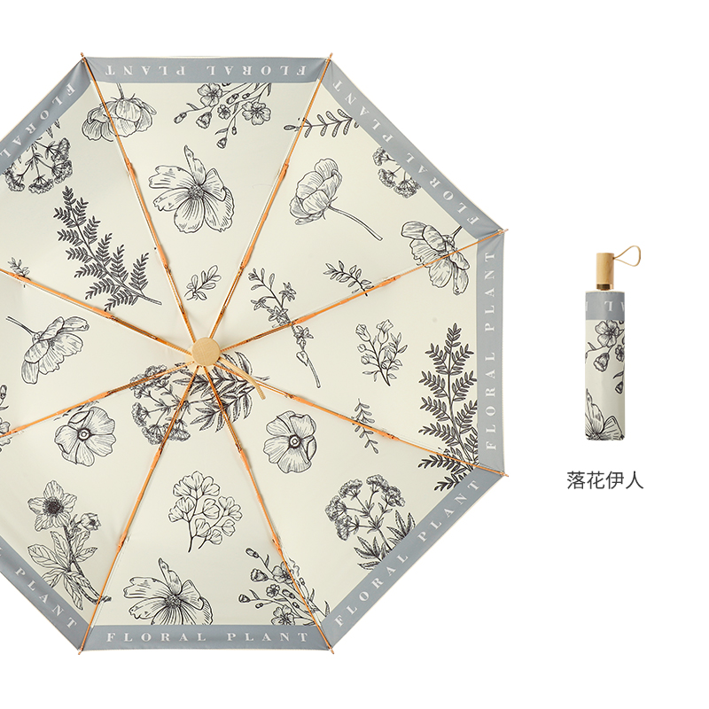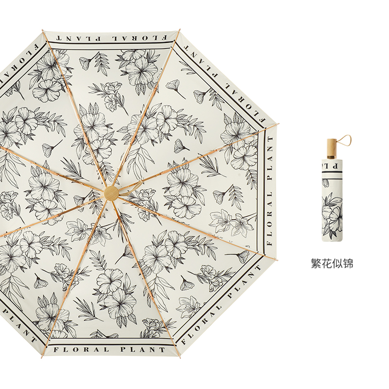 Name: Hand-Opened Umbrella with Floral Pattern, Small Gold Umbrella Frame: Gold Aluminum Alloy Canopy: Colorful Coated Fabric Handle: Solid Wood Handle Specification: 54cm*8K Diameter under umbrella: 98cm, Folded length: 28cm Packaging: Same color cloth cover, frosted bag packaging Quantity: 60 pcs/box Box dimensions: 48*30*28 cm Gross weight: 18KG
