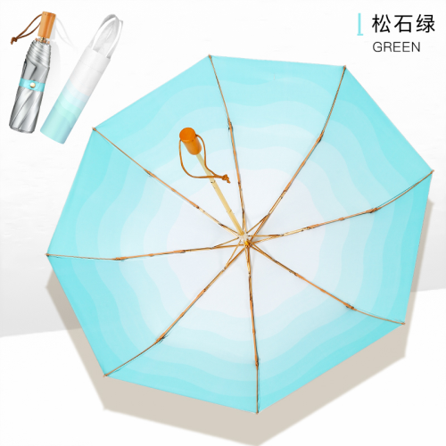 Name: Three-fold Manual Titanium-Coated Umbrella Frame: Gold-colored aluminum alloy frame Canopy: Titanium silver-coated fabric Handle: Solid wood handle Specification: 54*8, canopy diameter 98 cm, folded length 28 cm Packaging: Matching color fabric sleeve, matte bag packaging Quantity: 60 pieces/box Box dimensions: 50/32/30 Gross weight: 0.35