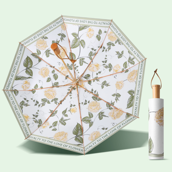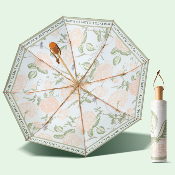 Name: Three-Fold Manual Digital Printing Umbrella Frame: Gold Aluminum Alloy Frame Canopy: Titanium Silver Coating Fabric Handle: Solid Wood Handle Specifications: 54*8 umbrella diameter, 98 cm, 28 cm folded length Packaging: Same-color fabric sleeve, matte bag packaging Quantity: 60 pieces/box Box Dimensions: 50/32/30 Gross Weight: 0.35 kg