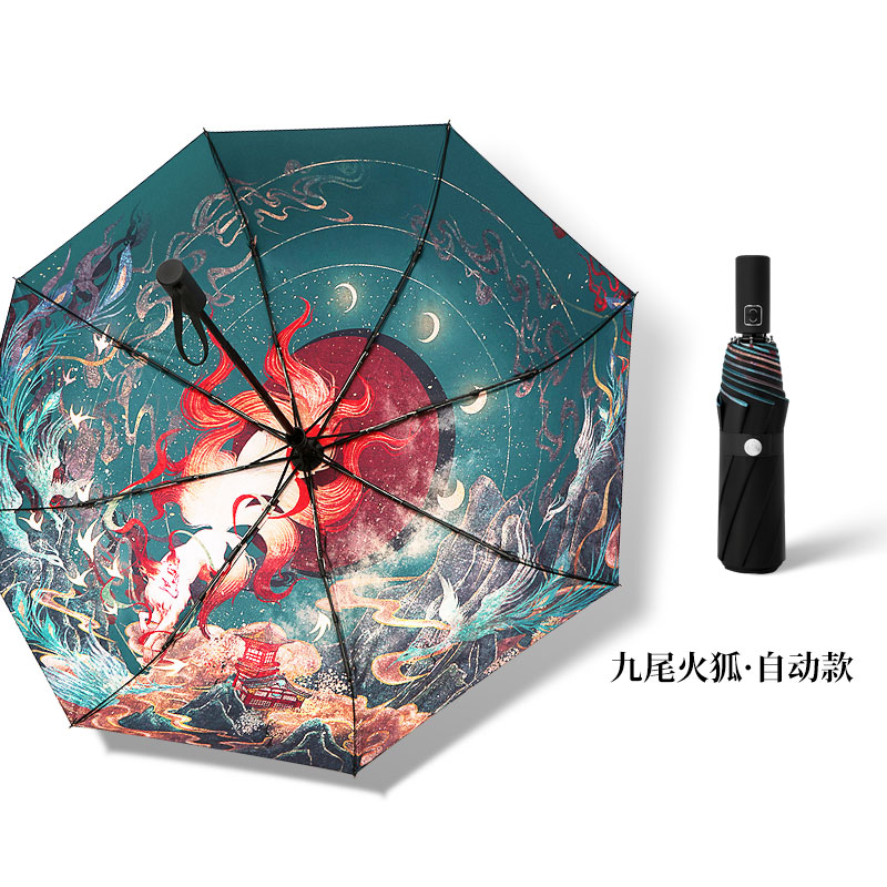 Name: Three-Fold Automatic Frame: Steel frame Canopy: Black coated fabric Handle: Rubber paint Specifications: 54*8, canopy diameter 95cm, folded length 16cm Packaging: Same-color cloth cover, matte bag packaging Quantity: 60 pieces/box Box dimensions: 48*30*28 cm Gross weight: 18KG