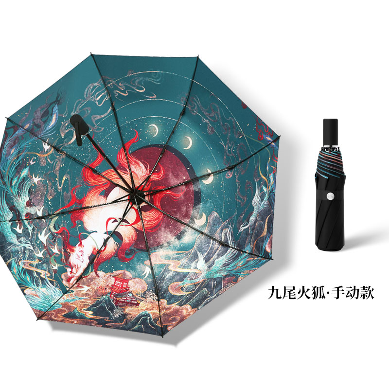 Name: Three-Fold Digital Printing Umbrella Frame: Black Coated Paint Umbrella Fabric: Black Coating Material Handle: Small Wooden Handle Specifications: 54*8, Diameter under umbrella 95cm, Folded length 18cm Packaging: Same color fabric cover, Matte bag Packing Quantity: 60 pcs/box Box Dimensions: 50/32/30 cm Gross Weight: 18KG
