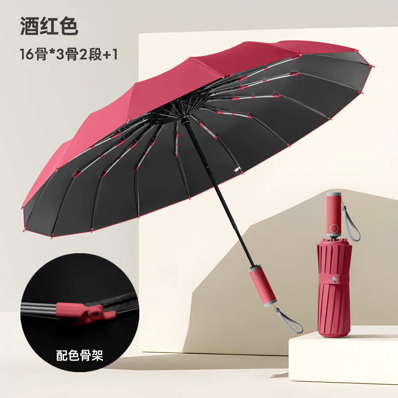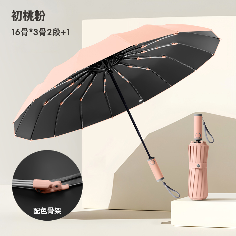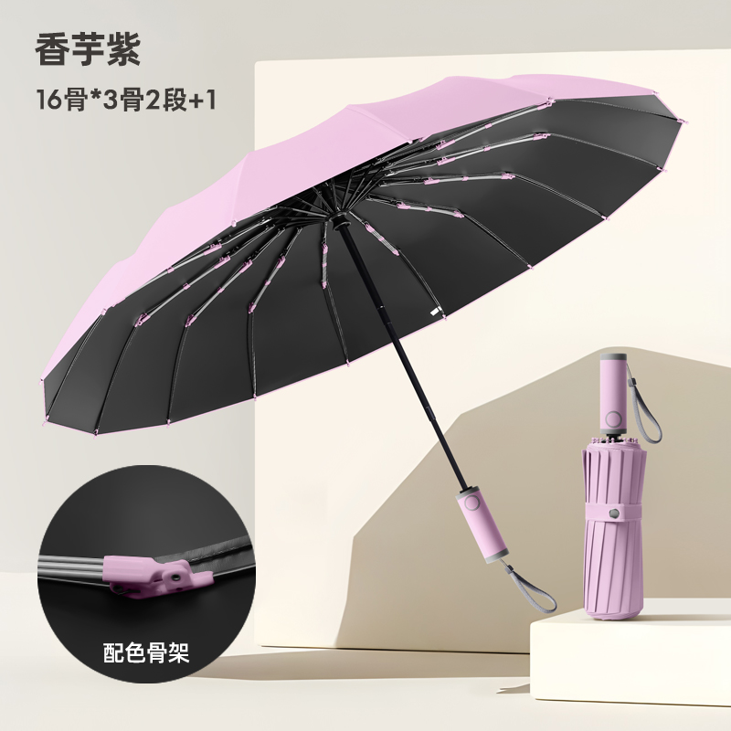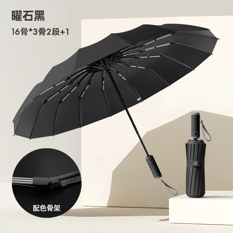Name: 16-Rib Automatic Umbrella Frame: 32-rib frame Canopy: Black rubber natural light Handle: ABS handle Specifications: 58.5*16, diameter under umbrella 105cm, folded length 32cm Packaging: Same-color cloth cover, frosted bag Quantity per box: 0 pcs/box Box size: 45*35*30cm Individual umbrella packaging size: 34*6.5*6.5cm Weight: 0.57kg Gross weight: