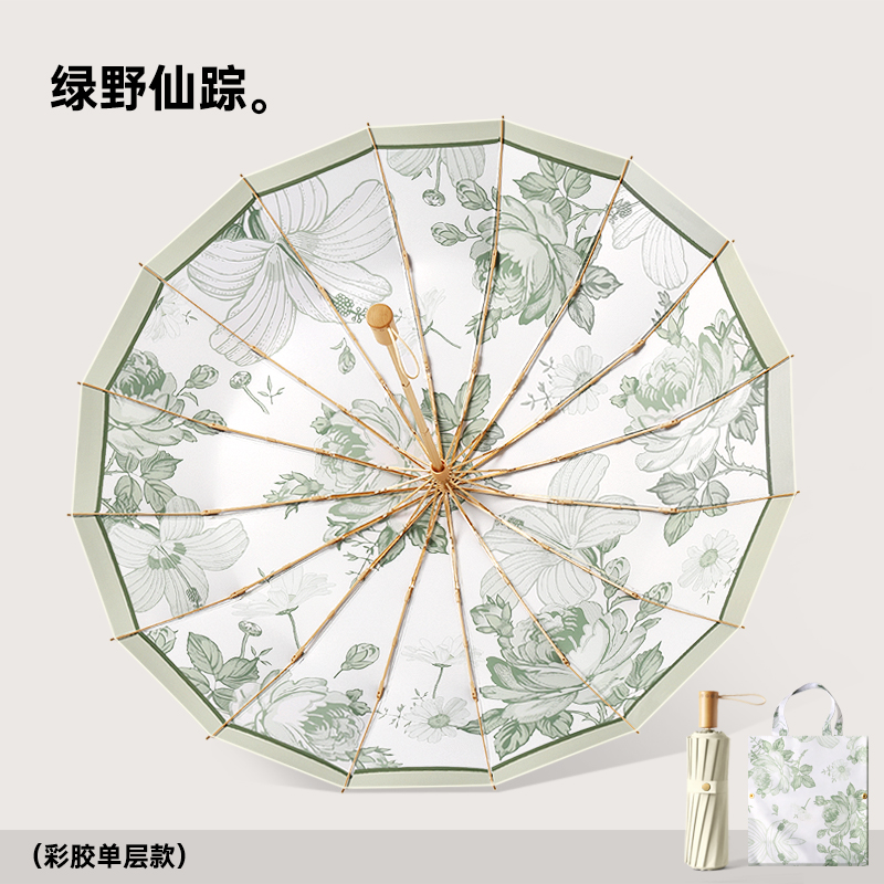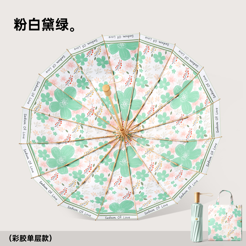 Name: 16-Rib Color Coated Gift Bag Umbrella Printing: Digital Printing Frame: Gold Aluminum Alloy Canopy: Color Coated Fabric Handle: Solid Wood Handle Specifications: 54*16, Umbrella Diameter When Open: 100 cm, Length When Folded: 28 cm Packaging: Same Color Fabric Cover, Frosted Bag Quantity Per Box: 50 pieces Box Dimensions: 50*32*30 cm Single Umbrella Packaging Size: 30*7*7 cm Weight: 0.42 kg Gross Weight: 21 kg
