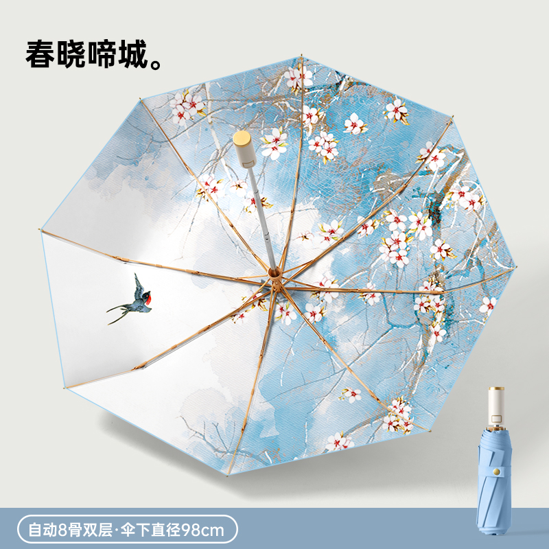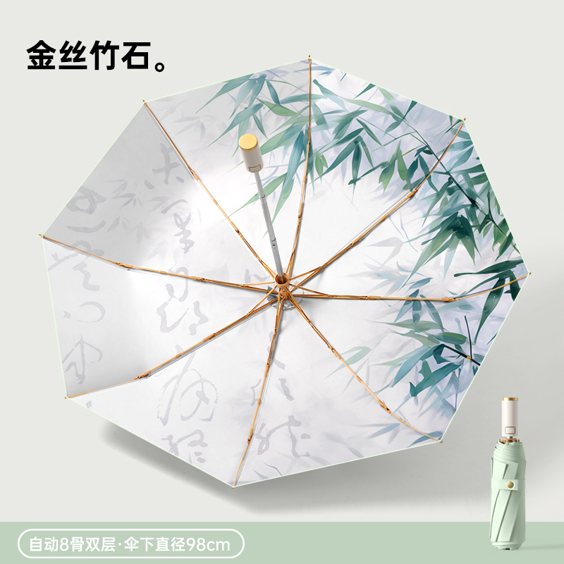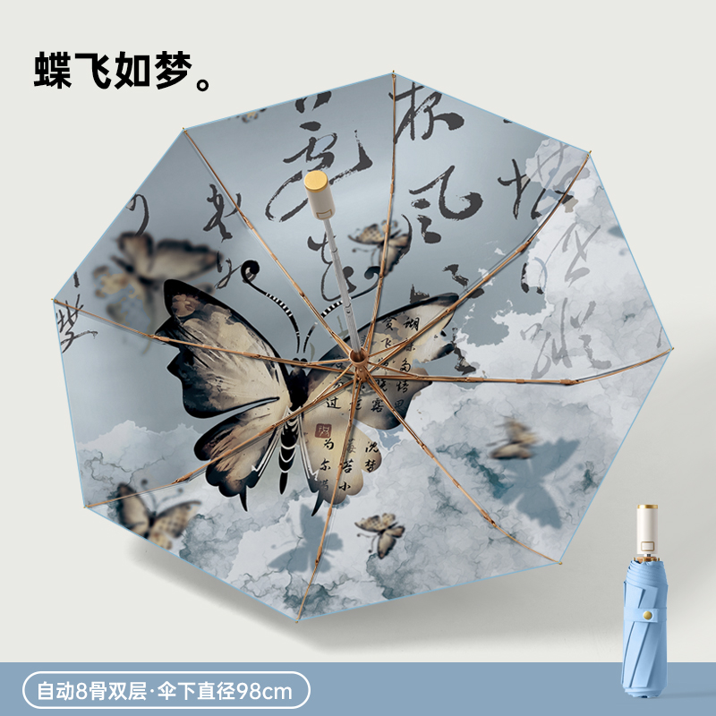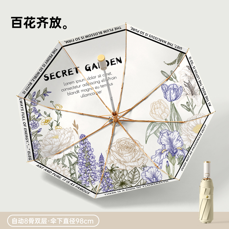 Name: Double-layer digital printing automatic umbrella Frame: Metal frame Canopy: Outer layer colored PVC, inner layer impact fabric Handle: Automatic handle Specifications: 54*8, umbrella span 95cm, folded length 18cm Packaging: Same-color fabric sleeve, frosted bag Quantity per box: 60 pcs/box Box dimensions: 50/32/30 cm Gross weight: 18 KG