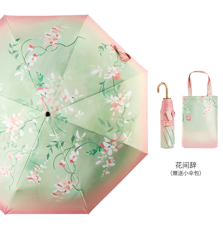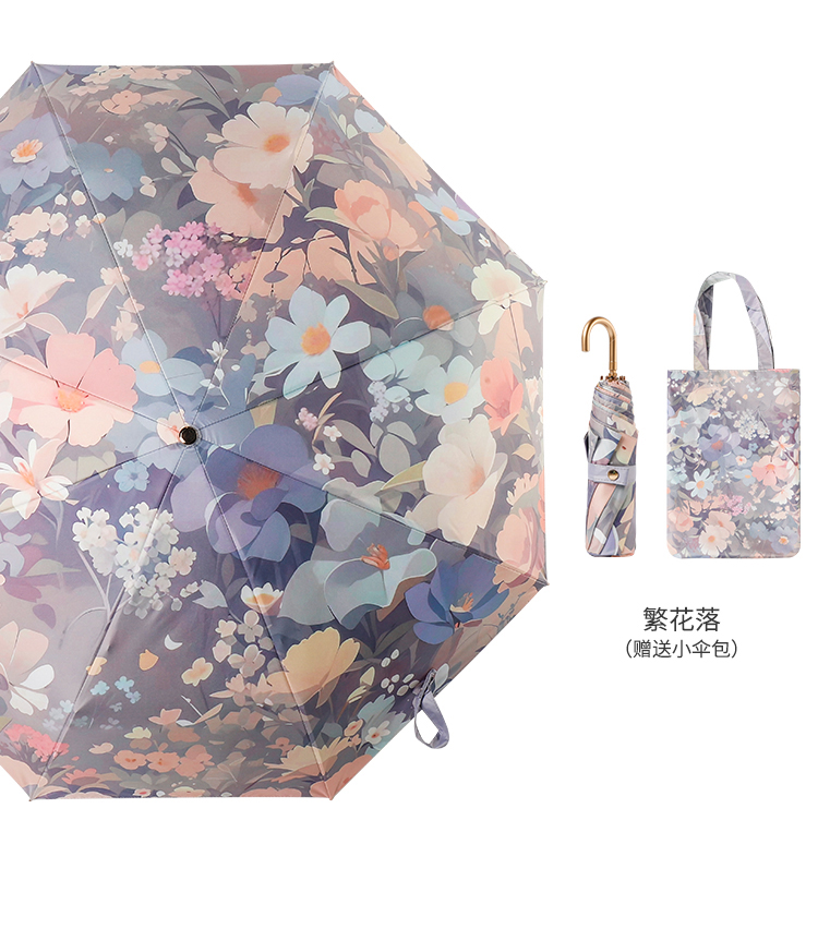 Name: Three-Fold Small Gold Hook Raincoat Fabric Gift Bag Umbrella Fabric: Raincoat Fabric Umbrella Frame: Aluminum Alloy Frame with Handle; Aluminum Alloy Handle Specifications: 54*8, Diameter under umbrella 96cm, Folded Length 28cm Packaging: Same Color Fabric Sleeve, Bagged Quantity per Box: 60 pcs/box Box Dimensions: 50*32*30 cm Single Umbrella Packaging Size: 30*7*7 cm Weight: 0.33 kg Gross Weight: 18.4 kg