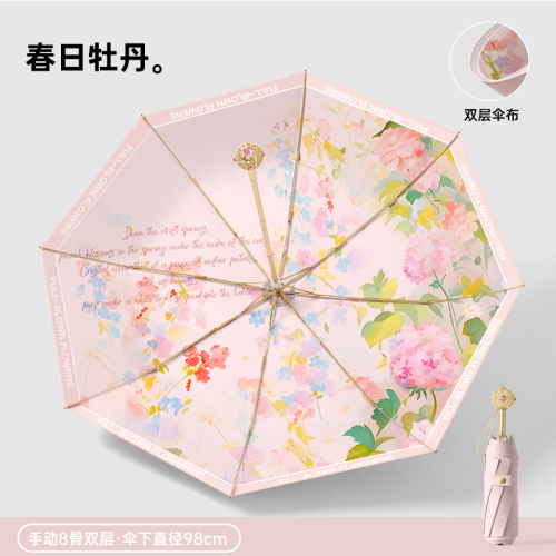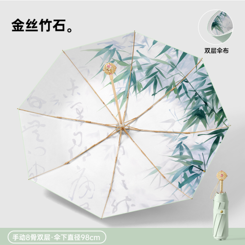 Name: Three-Fold Double-Layer Manual Color-Coated Umbrella with Exquisite Handle Umbrella Fabric: Color-coated material Umbrella Frame: Aluminum alloy frame with handle; Aluminum alloy handle. Specifications: 54*8, diameter under umbrella 96 cm, folded length 28 cm Packaging: Same color fabric sleeve Quantity per box: 60 pieces/box Box Dimensions: 50*32*30 cm Single Umbrella Packaging Size: 30*7*7 cm Weight: 0.33 kg Gross Weight: 18.4 kg