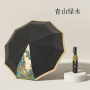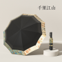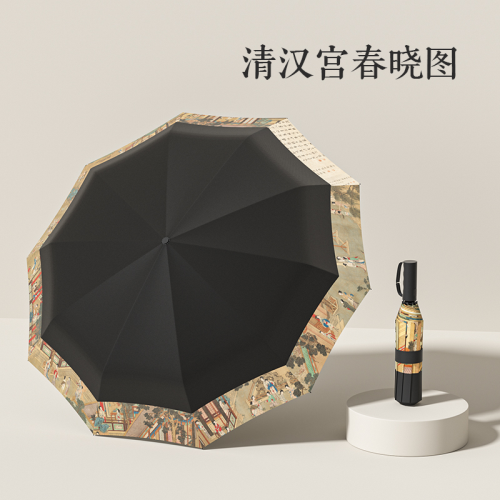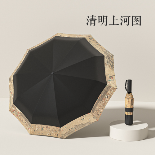 Name: Three-Fold Automatic Umbrella with Chinese Style Frame: Aluminum Alloy, Fiber Canopy: Black Coated Fabric Handle: Rubber Coating Size: 58.5*10 cm Diameter when open: 105 cm, Length when folded: 32 cm Packaging: Same-color fabric sleeve, frosted bag Quantity per box: 50 pieces Box dimensions: 48*35*28 cm Gross weight: 24 KG