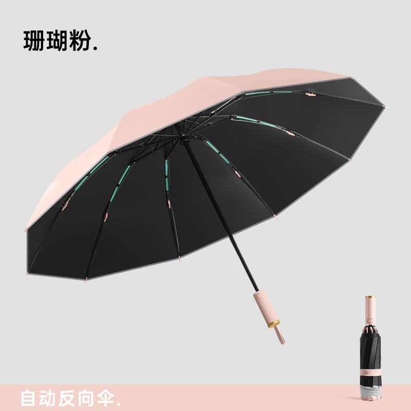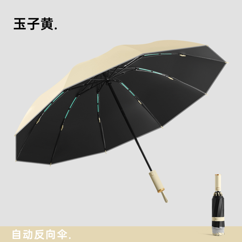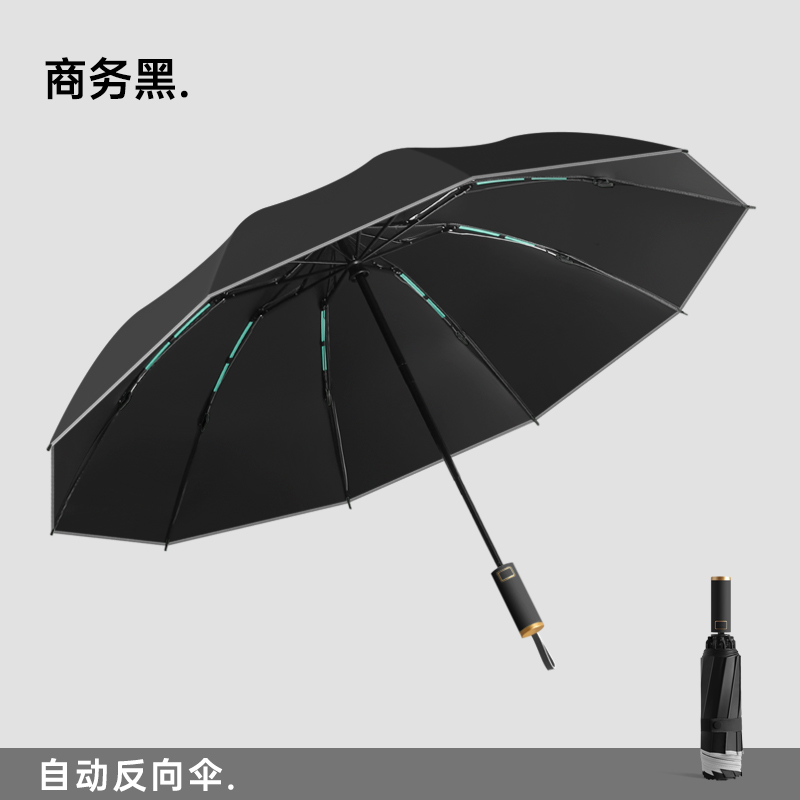 Name: Three-fold automatic reverse umbrella with black rubberized fabric Frame: Black painted steel, double fiber ribs Canopy: Black rubberized fabric Handle: Specifications: 58.5*10 cm Umbrella diameter when open: 105 cm, length when folded: 32 cm Packaging: Same-color fabric sleeve, frosted bag Quantity per box: 50 pieces/box Box dimensions: 48*35*28 cm Gross weight: 24 KG