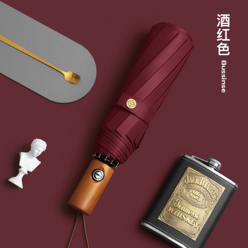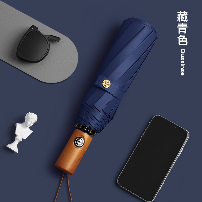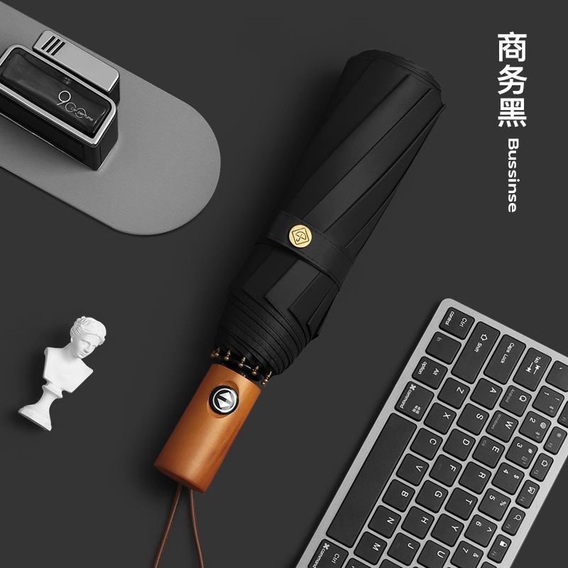 Name: 10-Rib Three-Fold Automatic Umbrella with Large Wooden Handle, Black Coated Fabric Sun Umbrella Frame: Steel, Fiberglass Canopy: Black Coated Fabric Handle: Solid Wood Handle Size: 585*10 Diameter when open: 103 cm, Length when folded: 31 cm Packaging: Matching fabric bag, matte bag packaging Quantity: 50 pieces/box Box dimensions: 45/35/30 cm Gross weight: 24 kg Single umbrella packaging size: 34*6.5*6.5 cm Weight: 0.462 kg