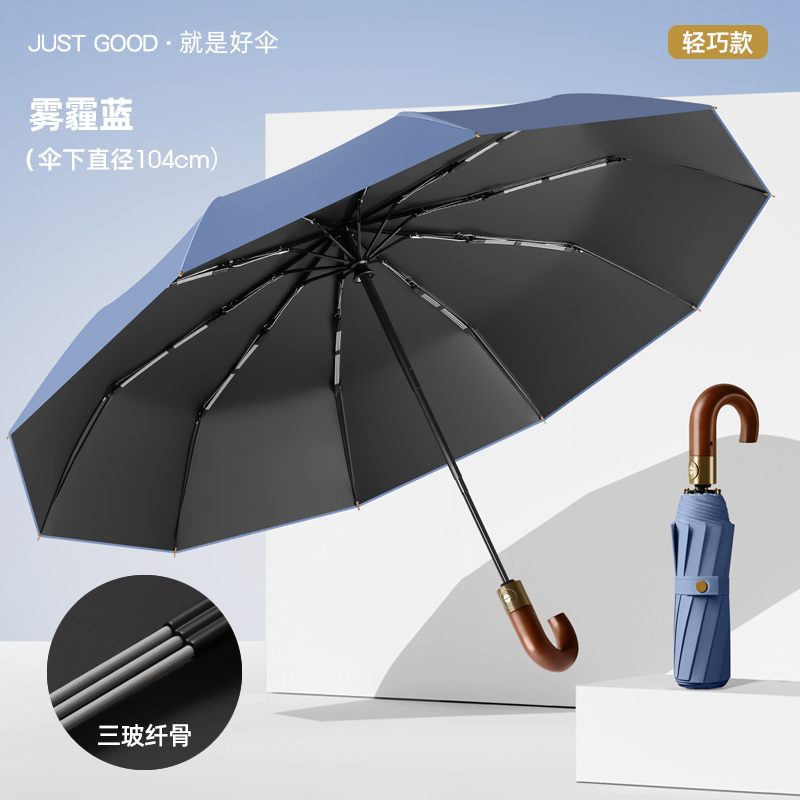 Name: 10-Rib Three-Fold Automatic Umbrella with Large Wooden Handle, Black Coated Fabric Sun Umbrella Frame: Steel, Fiberglass Canopy: Black Coated Fabric Handle: Solid Wood Handle Size: 585*10 Diameter when open: 103 cm, Length when folded: 31 cm Packaging: Matching fabric bag, matte bag packaging Quantity: 50 pieces/box Box dimensions: 45/35/30 cm Gross weight: 24 kg Single umbrella packaging size: 34*6.5*6.5 cm Weight: 0.462 kg