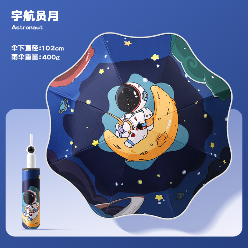 Name: Three-Fold Astronaut Umbrella Frame: Steel frame with fiber double ribs Canopy: Black-coated fabric Handle: Astronaut handle Size: 54*8 cm Diameter when open: 102 cm, Length when folded: 31 cm Packaging: Matching color fabric cover, OPP bag packaging Quantity: 60 pcs/box Box dimensions: 45/35/30 cm Gross weight: 17 kg
