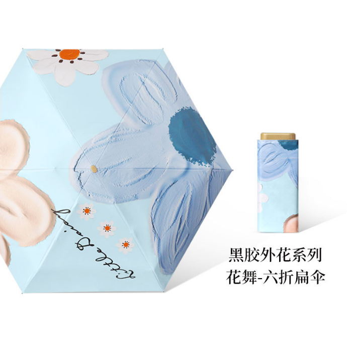 Name: Colorful Coated Five-Fold Umbrella Frame: Gold-colored aluminum alloy frame Canopy: Double-sided floral black coating fabric, semi-shading black coating Handle: Solid wood handle Specifications: 54*8, diameter under umbrella 96cm, folded length 18cm Packaging: Matching color fabric sleeve, bagged Quantity per box: 60 pieces/box Box dimensions: 50/32/30