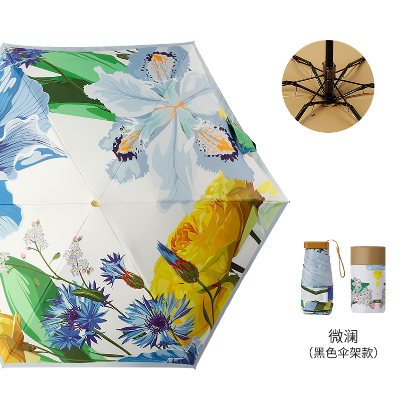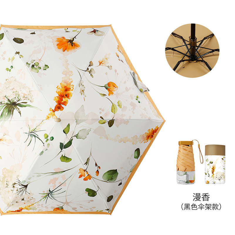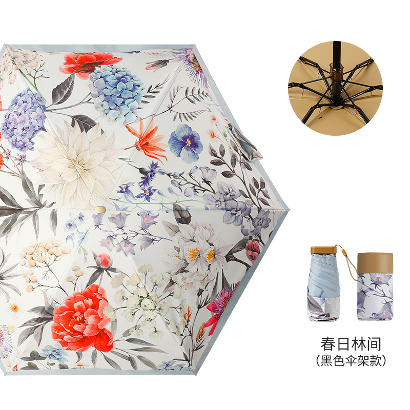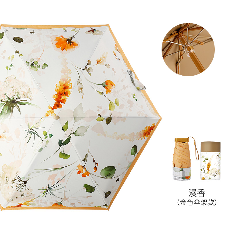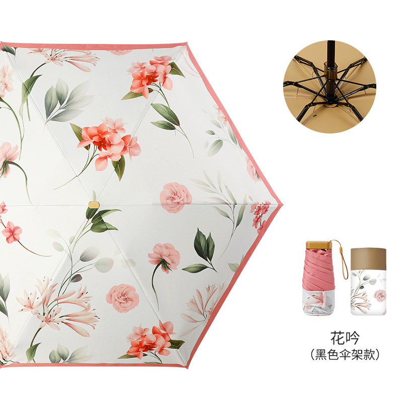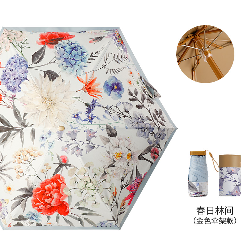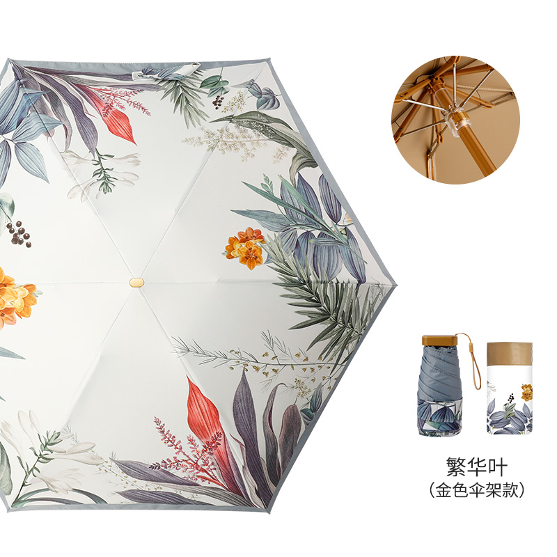 Name: Colorful Coated Five-Fold Umbrella Frame: Gold-colored aluminum alloy frame Canopy: Double-sided floral black coating fabric, semi-shading black coating Handle: Solid wood handle Specifications: 54*8, diameter under umbrella 96cm, folded length 18cm Packaging: Matching color fabric sleeve, bagged Quantity per box: 60 pieces/box Box dimensions: 50/32/30