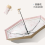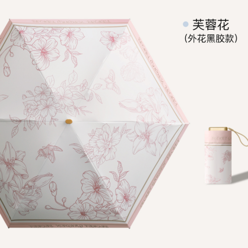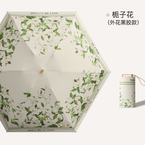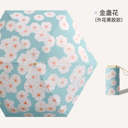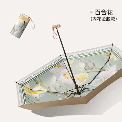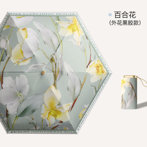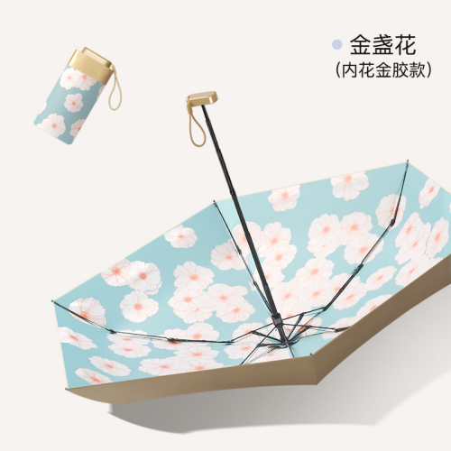 Name: Colorful Coated Five-Fold Umbrella Frame: Gold-colored aluminum alloy frame Canopy: Double-sided floral black coating fabric, semi-shading black coating Handle: Solid wood handle Specifications: 54*8, diameter under umbrella 96cm, folded length 18cm Packaging: Matching color fabric sleeve, bagged Quantity per box: 60 pieces/box Box dimensions: 50/32/30