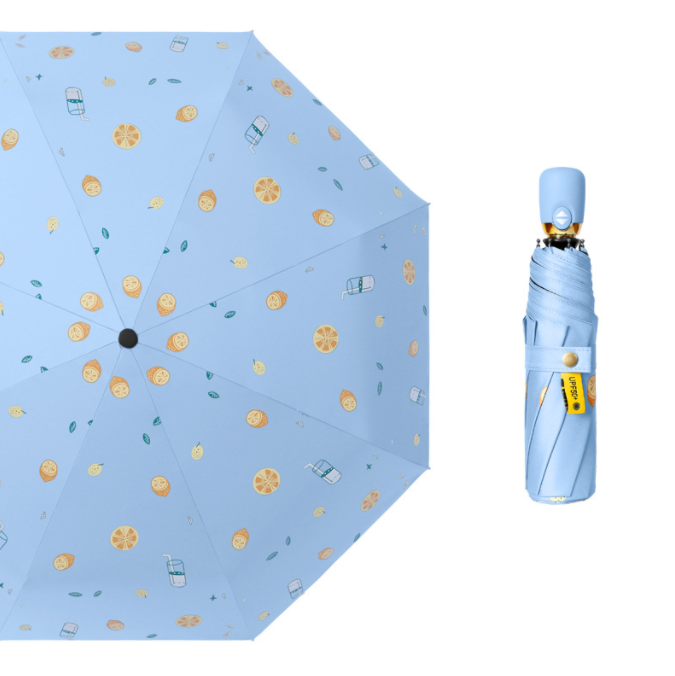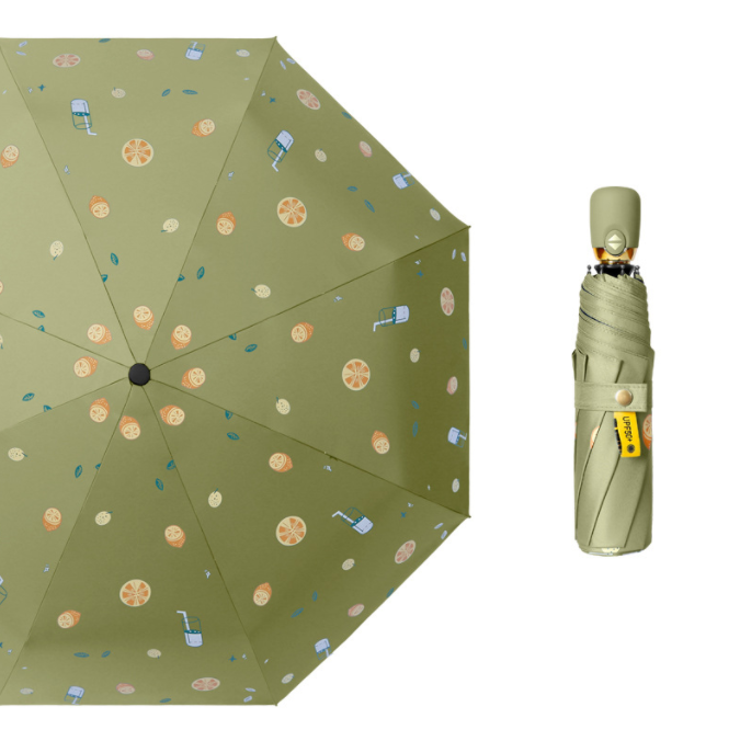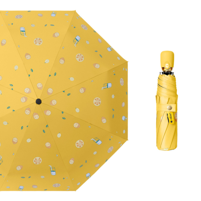 Name: 1 Automatic Fruit Umbrella Frame: Canopy: Black rubber fabric Handle: Rubber paint Size: 54cm * 8K Umbrella diameter: 100cm, folded length: 28cm Packaging: Matching color fabric sleeve, matte bag packaging Quantity: 60 pieces/box Box dimensions: 50*32*30 cm Single umbrella packaging size: 30*6*6 cm Weight: 0.37 kg Gross weight: 24.15 kg