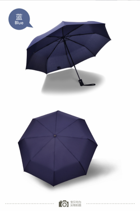 Name: Three-Fold Automatic Frame: Steel frame Canopy: Black coated fabric Handle: Rubber paint Specifications: 54*8, canopy diameter 95cm, folded length 16cm Packaging: Same-color cloth cover, matte bag packaging Quantity: 60 pieces/box Box dimensions: 48*30*28 cm Gross weight: 18KG