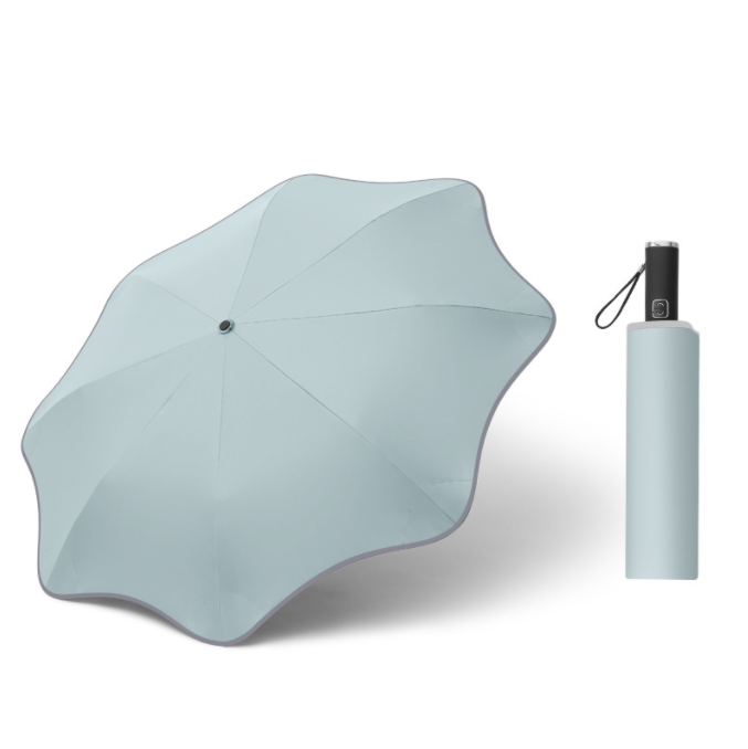 Name: Three-Fold Astronaut Umbrella Frame: Steel frame with fiber double ribs Canopy: Black-coated fabric Handle: Astronaut handle Size: 54*8 cm Diameter when open: 102 cm, Length when folded: 31 cm Packaging: Matching color fabric cover, OPP bag packaging Quantity: 60 pcs/box Box dimensions: 45/35/30 cm Gross weight: 17 kg