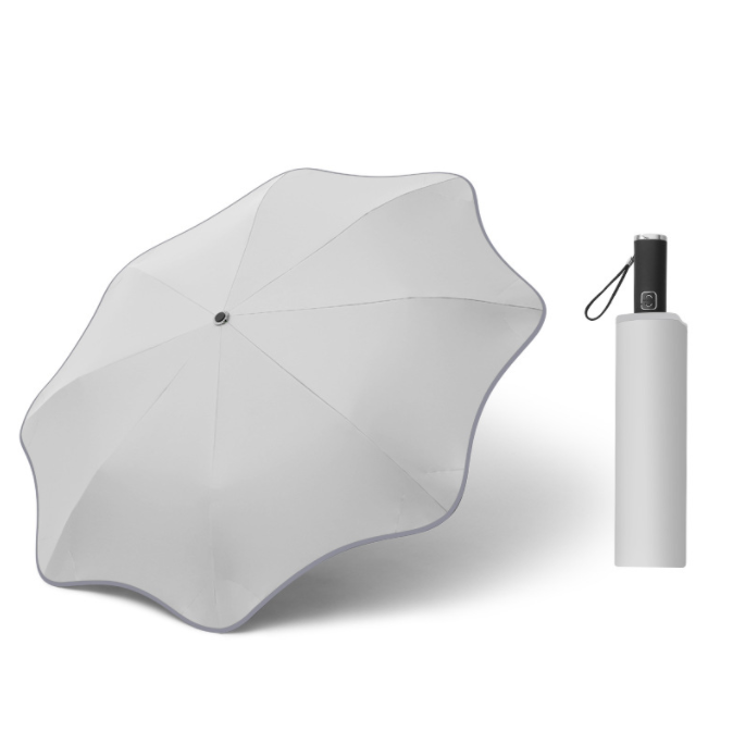 Name: Three-Fold Automatic Frame: Steel frame Canopy: Black coated fabric Handle: Rubber paint Specifications: 54*8, canopy diameter 95cm, folded length 16cm Packaging: Same-color cloth cover, matte bag packaging Quantity: 60 pieces/box Box dimensions: 48*30*28 cm Gross weight: 18KG