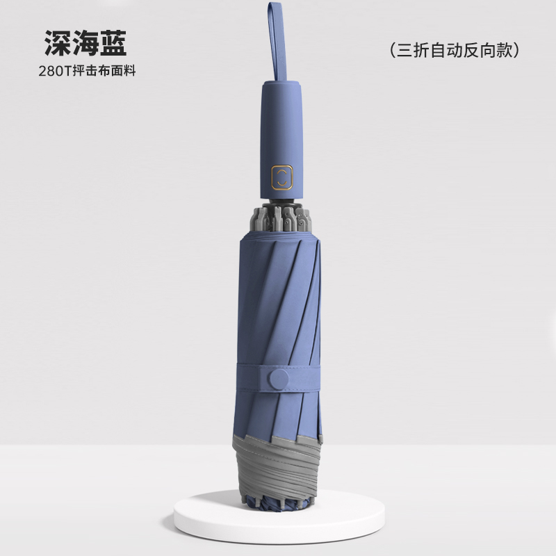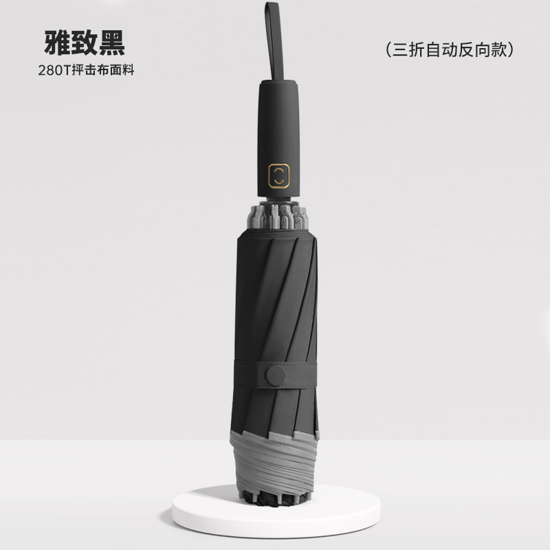 Name: 10-Rib Three-Fold Automatic Reverse 280T Frame: Aluminum alloy, fiber frame Canopy: Pongee fabric Handle: Rubber paint Specifications: 58.5*10 Diameter under umbrella: 105cm, folded length: 32cm Packaging: Matching fabric cover, frosted bag packaging Quantity: 50 pieces/box Box dimensions: 45*35*30 cm Single umbrella packaging size: 34*6.5*6.5 cm Weight: 0.42kg Gross weight: 22.5kg