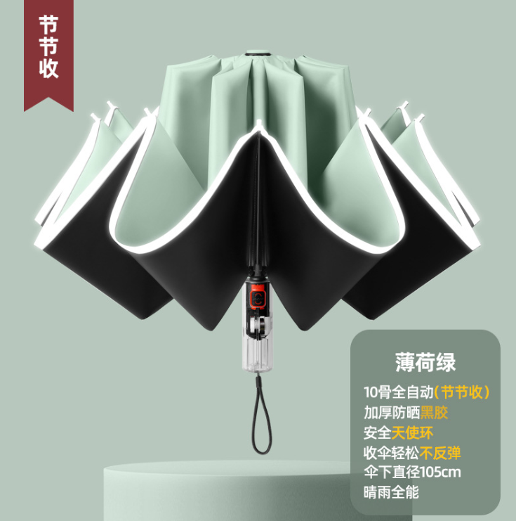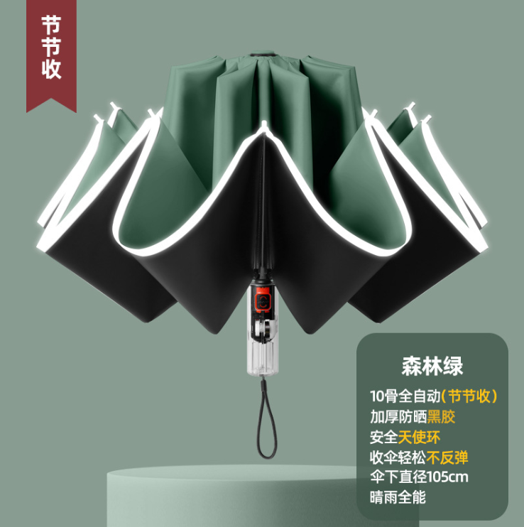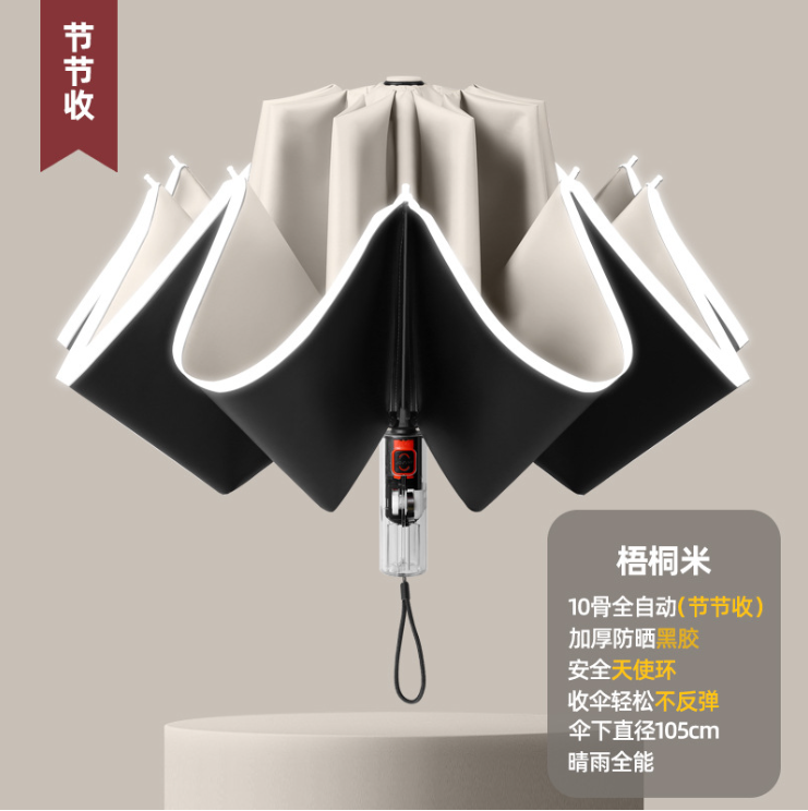 Name: 10-Rib Automatic Folding Umbrella Frame: Steel frame, fiber frame Canopy: Black fabric with natural light protection Handle: Solid wood handle Specifications: 58.5*10 cm Diameter when open: 105 cm, length when folded: 32 cm Packaging: Matching fabric sleeve, matte bag packaging Quantity: 50 pieces/box Box dimensions: 45/35/30 cm, Gross weight: 20 KG