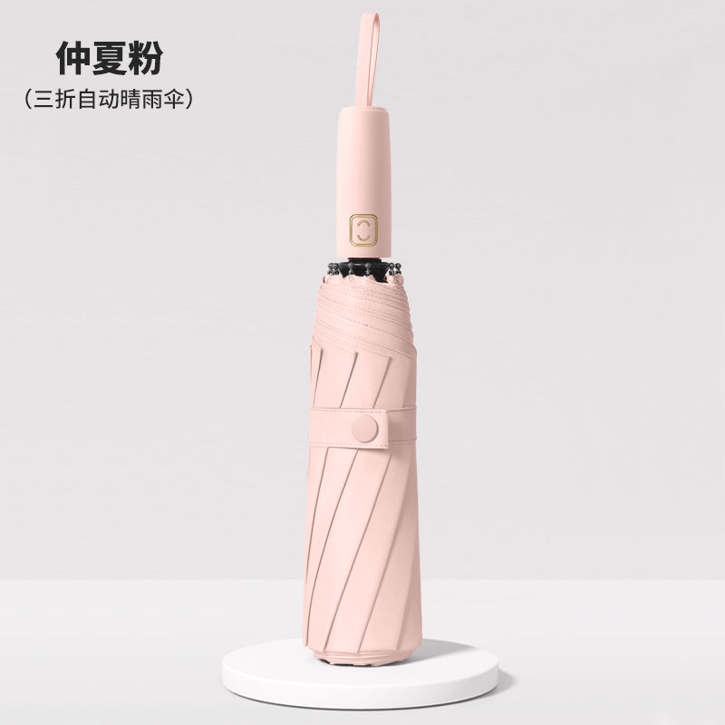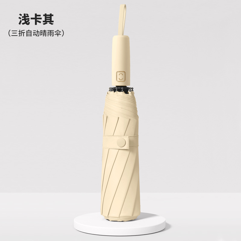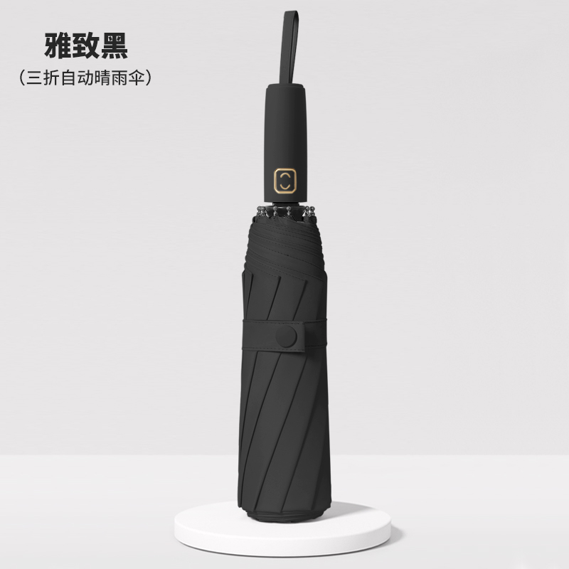 Name: Three-Fold Automatic Frame: Steel frame Canopy: Black coated fabric Handle: Rubber paint Specifications: 54*8, canopy diameter 95cm, folded length 16cm Packaging: Same-color cloth cover, matte bag packaging Quantity: 60 pieces/box Box dimensions: 48*30*28 cm Gross weight: 18KG