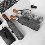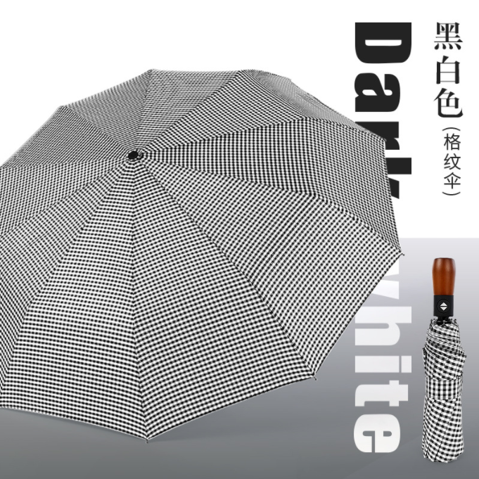 Name: Black Checkered Automatic Umbrella Frame: Black lacquered steel frame Canopy: Densely woven checkered fabric Handle: Solid wood handle Specifications: 58.5*10 Diameter when open: 105 cm, Length when folded: 30 cm Packaging: Matching color cloth cover, frosted bag packaging Quantity: 50 pieces/box Box dimensions: 45*35*30 cm Individual umbrella packaging size: 34*6.5*6.5 cm Weight: 0.42 kg Gross weight: 22.8 kg